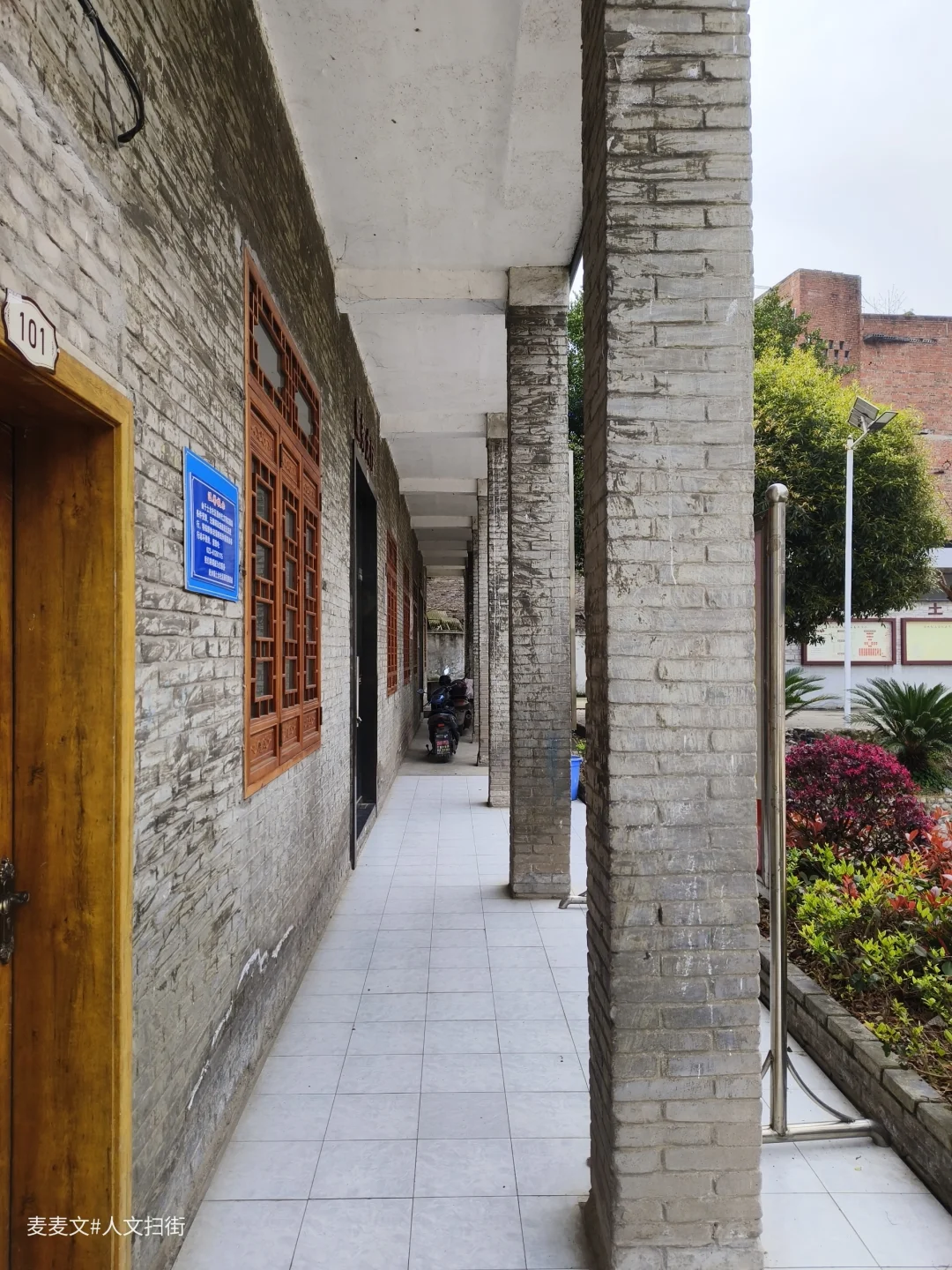 人字型坡顶砖木结构,主入口山墙面中心镶刻五角星装饰,窗洞口采用平拱砖过梁,侧立面整齐排列砖柱与通风窗口,整体风格朴实有力,体现了社会主义建设时期的时代特征。