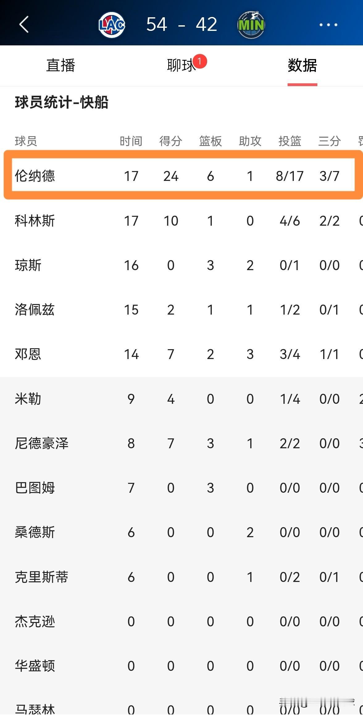 快船巨星伦纳德真是太不爱惜自己的身体了!在今天快船客场挑战森林狼的比赛中,目前双方半场战罢,快船在伦纳德的带领下以54:42领先对手。在前两节比赛中,伦纳德在攻防两端都打出了超强的统治力,他在首发出战的17分钟里,投篮17中8,其中三分球7中3、罚球6中5狂砍24分,外加6篮板4抢断,他的场上正负值为+15。 虽然伦纳德在上半场比赛中的表现极其出色,但是在我看来,伦纳德过于不爱惜自己的身体了,以伦纳德目前的打球方式来看,恐怕用不了多久伦纳德又要因伤缺阵了。