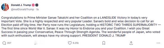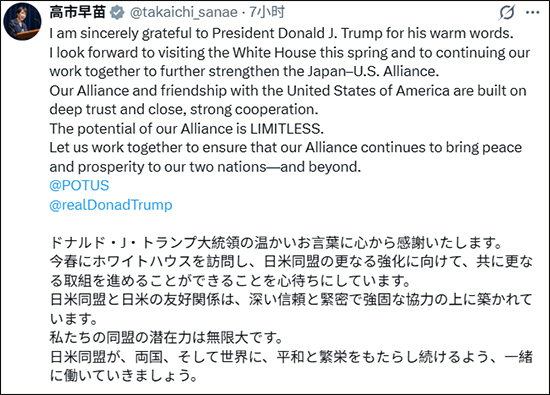 【高市早苗日英双语发帖】高市早苗感谢特朗普 据日本放送协会(NHK)2月9日报道,在8日举行的日本众议院选举中,日本首相高市早苗所在的自民党和日本维新会组成的执政联盟获得过半数议席。