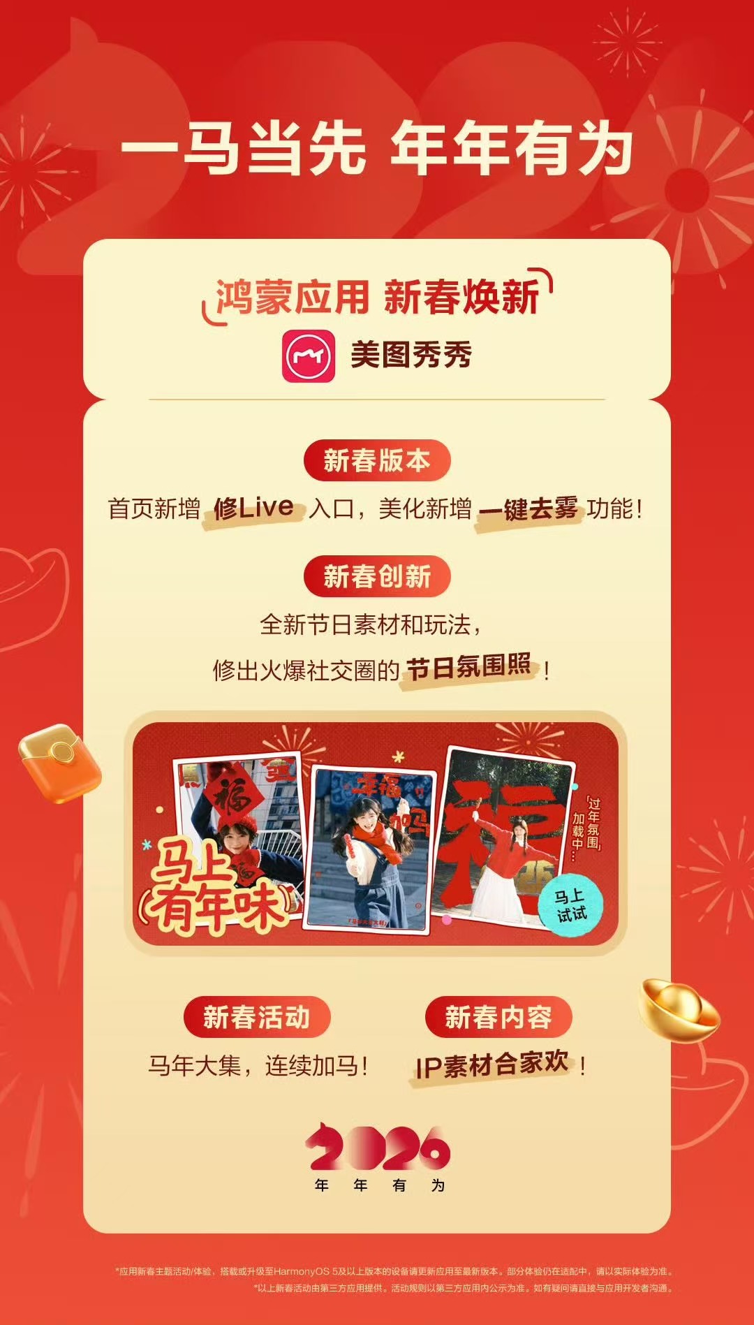 鸿运马上来 过年在家最忙的是嘴,最累的恐怕是我的手机!又要抢红包又要刷视频,又要拍照记录又要…….但这下不着急了,鸿蒙应用大焕新,推出超多新春功能~