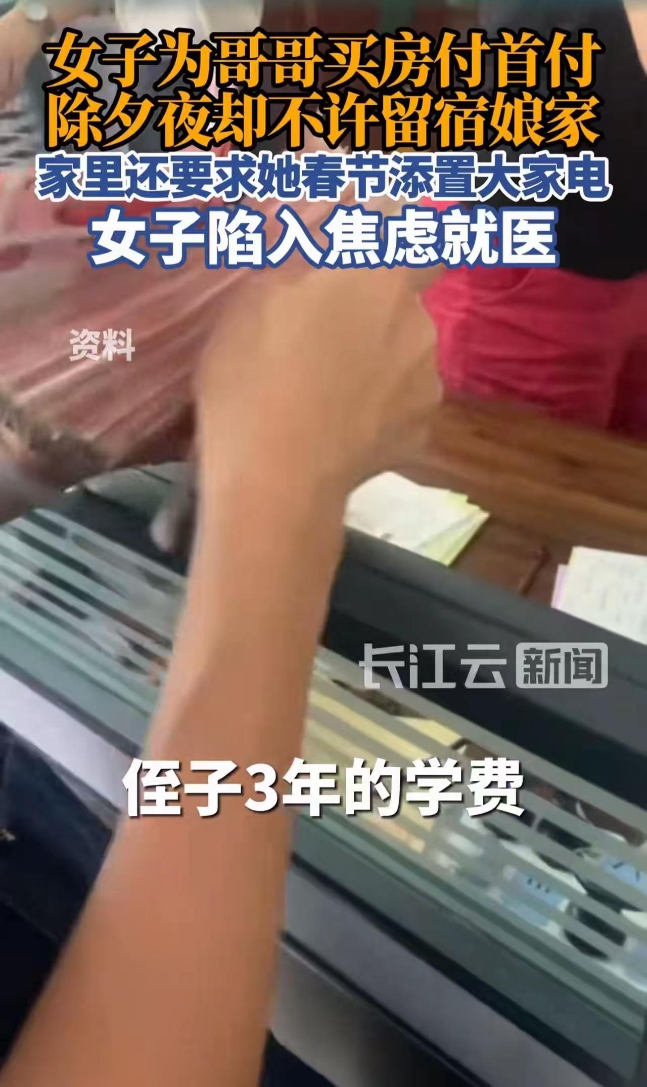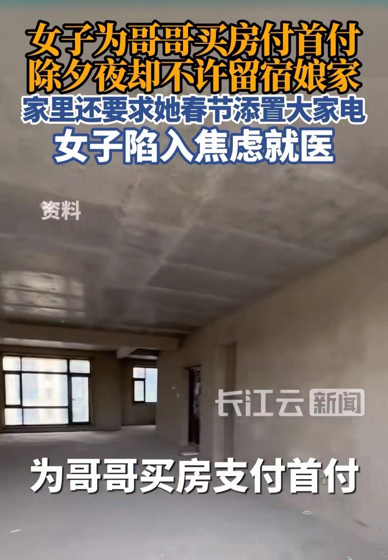 女子为哥哥买房付首付,除夕夜却不许留宿娘家,家里还要求她春节添置大家电,女子陷入焦虑就医!女子:“同样是父母生的孩子,为什么要这样区别对待?” 在这个春节,本该是家人团聚、温暖互助的时刻,却变成了一场令人心碎的“家庭大考”。女子为了哥哥的未来,倾注了全部的心血——不仅为他买房付出巨款,还在除夕夜希望回娘家团聚,却被拒之门外。她的心像被针扎一般,难以忍受那份被冷落的孤独感。 更令人心疼的是,家里竟然还要求她在春节期间添置大家电,仿佛她的牺牲和付出只是理所当然的“任务”。她陷入了深深的焦虑,甚至因此就医。这个曾经以爱和关怀为纽带的家庭,为什么会变成这样一个“差别对待”的战场? 或许,很多读者都曾在类似的家庭关系中迷失过。我们常常会问:“为什么同样是父母的孩子,偏偏我就要受到不同的对待?”这不仅仅是一个家庭内部的小事,更折射出社会中普遍存在的“偏心”和“期待不平等”的现实。 这位女子的故事,像极了许多年轻人在家庭中的无声抗争。她用行动证明了自己的责任和爱,却在无形中被标签化、被边缘化。她的焦虑、她的无助,折射出的是一种深层次的家庭关系困境——我们到底在为谁付出?我们是否被教导要无条件付出,却没有得到应有的尊重和理解? 这个春节,也许我们都应该停下来思考:家庭的温暖究竟在哪里?我们是否在无形中被灌输了“孝顺”的定义,却忽略了自己作为一个独立个体的价值?家庭不应该是“你付出越多,得到越少”的战场,而应是彼此理解、共同成长的港湾。 让我们为那些像她一样的年轻人发声,也为所有在家庭中默默付出的你我点赞。家庭的爱,应该是平等的,是彼此尊重的,而不是无休止的牺牲和被利用。或许,只有当我们敢于站出来,问一问“为什么要这样对待我”,这个家庭的裂痕才会慢慢愈合。 春节的意义,不仅仅是团聚,更是重新审视我们与家人的关系。让我们用行动去改变那些不合理的期待,让爱变得更纯粹、更真实。因为,只有当我们都学会爱自己,家庭的温暖才能真正温暖每一个心灵。
