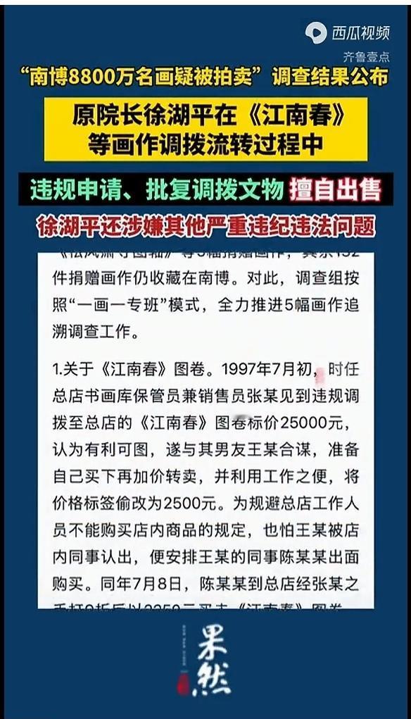 南博事件通报:5幅画作追查结果: 《江南春》、《仿北苑山水轴》、《双马图轴》追回, 《设色山水轴》从未流出。 《松风萧寺图轴》:1仍在多地全力追查。 我是真心觉得,这种古玩字画,我始终认为,只存在文物价值,也就是给探究创作时代的历史真相提供线索,除此之外没什么价值。 你说艺术价值?我真觉看仿品,甚至看临时打印出来的,都毫无区别。 看所谓的真迹,只有装x的作用。那些拍卖、炒作,就纯属金融游戏了,并不是物品本身的价值。