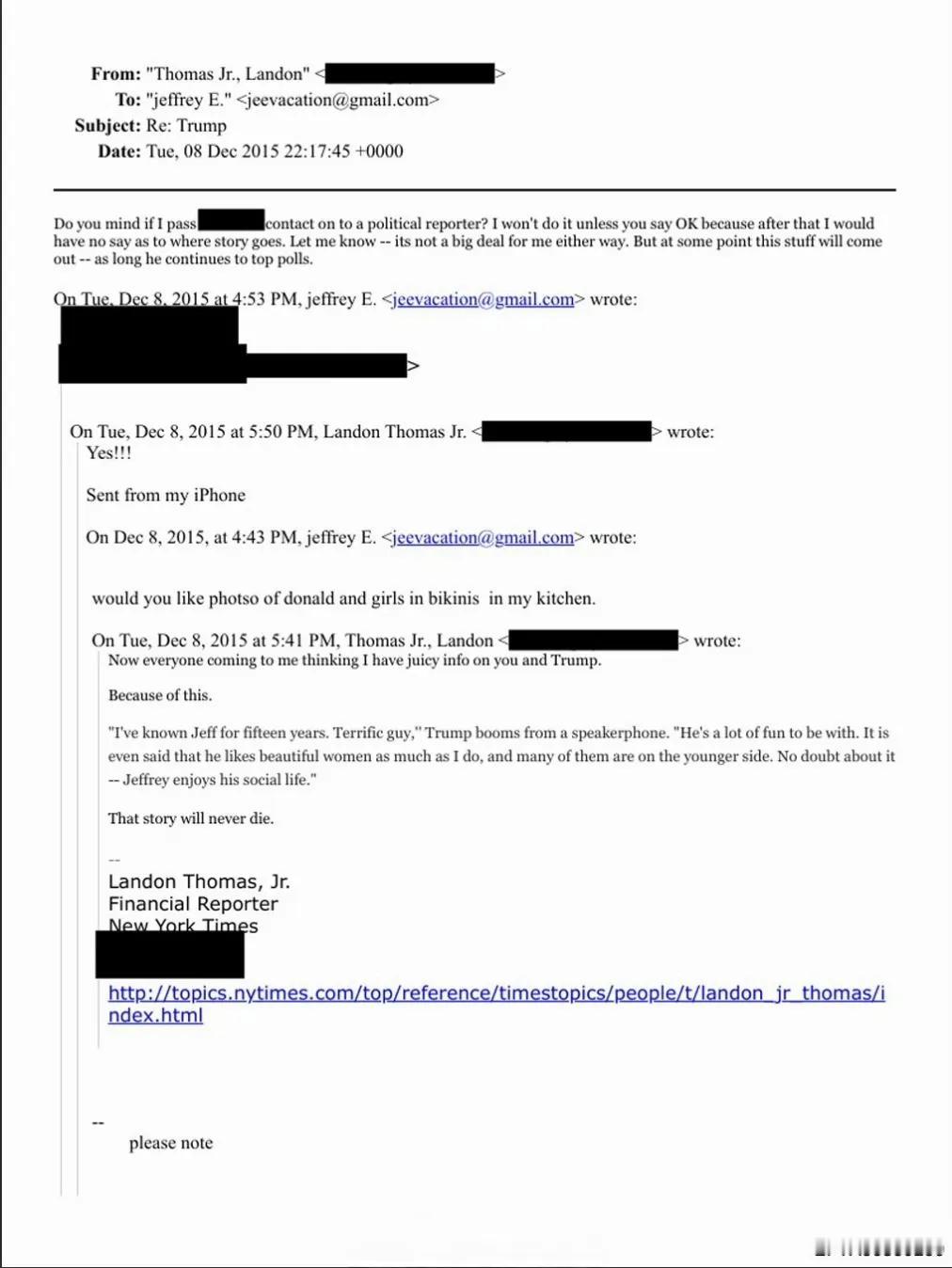 已公布的爱泼斯坦档案中涉及美国总统老特的非常多,其中2015年12月的一份电子邮件显示,《纽约时报》的记者小兰登·托马斯曾向爱泼斯坦索要有关老特的劲爆内幕,而爱泼斯坦为其提供了“唐纳德和穿着比基尼的女孩在我厨房里的照片”(似乎没有在这次公布的爱泼斯坦档案中)。托马斯的回答是:“这个故事永远不会被遗忘。” 老特因公开的爱泼斯坦档案提及他的名字达上千次,形象大跌,记者们如果深挖的话,有关老特的黑料必然大把大把。 而从爱泼斯坦为小兰登·托马斯提供有关老特的私密照片,可以看出爱泼斯坦丝毫没有为老特的行为进行保密的意思,很不够朋友。