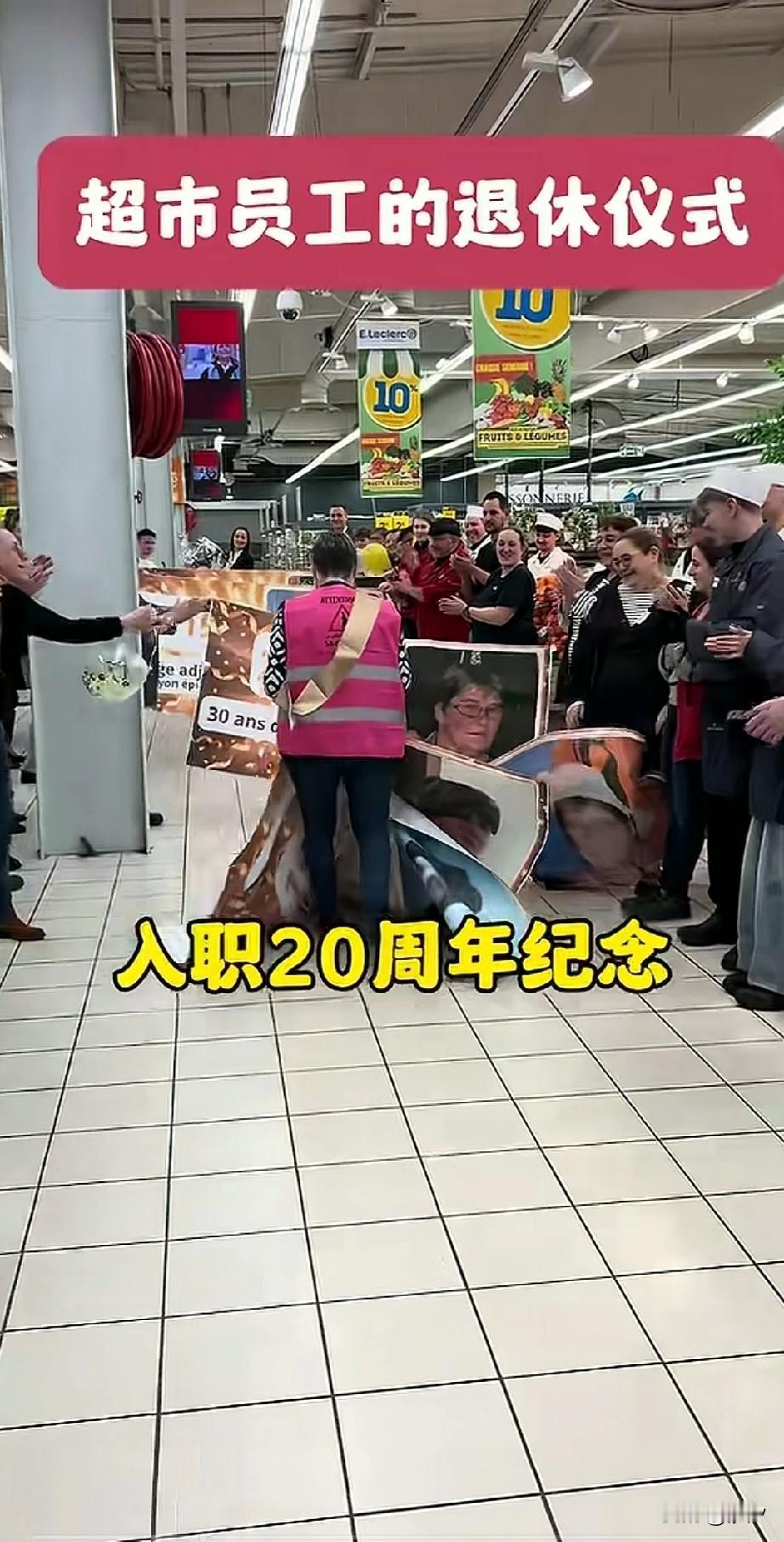 国外超市员工能干到退休,国内超市员工也就几年,这真是血淋淋的现实! 国外一超市大妈在超市工作了20年,从1984年入职,直接干到2026年,该退休的时候,员工们都为他举办了盛大的退休仪式! 公司的领导更是拿着鲜花给她了拥抱,这位大妈也是开心的走过了大家给他曲折的横幅,那代表了他每一年的努力! 女经理抱着她,两人开心极了,随后他和大家进行了合影留念,毕竟要离开自己工作20年的地方,还真是有些舍不得! 如果在国内你根本干不了这么久,当你年龄不符合规定的时候,直接就辞退,这就是中外超市的本质区别! 大家觉得超市打工有前途吗? 你还会逛超市吗 超市打工 超市人打工 超市月薪 超市变迁 美国超市情景