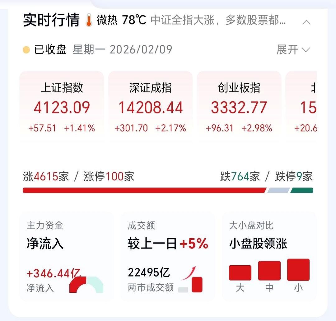 今天市场高开高走,三大指数都是大涨,创业板指上涨了2.98%,收于3332点,上证指数上涨了1.41%,收于4123点。 看着这满屏的红盘,很多人心里估计又开始躁动了,觉得这把稳了,明天还得接着奏乐接着舞。 但我得给大伙儿提个醒,这热闹背后其实藏着不少门道,别光顾着高兴,忘了看脚下的路。 首先得看钱,两市成交额虽然过了2.2万亿,这数字确实不小,但你仔细算算,比上周五也就多了那么一丢丢。 要想一口气冲破前高4190点那道硬坎,这点新增量能根本不够看,就像车子爬大坡,油门没踩到底,后劲儿容易跟不上。 再一个,马上就要过春节了,满打满算就剩四个交易日,这时候主力资金比谁都精,多半是想着落袋为安,而不是这时候大规模冲进去当解放军。 有个数据特别有意思,今天虽然指数涨得欢,但减仓的人数比加仓的还要多,这说明不少散户朋友是趁着大涨赶紧回本走人,准备拿着钱踏实过年呢。 这种抛压一旦形成,明天想继续大涨难度不小。 加上今天个股普涨这种极致行情,很难连续两天都这么嗨,明天分化是大概率事件。 所以操作上千万别太冲动,别一看涨了就怕踏空往里冲。 手里拿着白酒、医药这些基金定投的朋友,按部就班就行,别乱了节奏。 要是明天缩量硬拉,反而得警惕是不是诱多,到时候该止盈就得止盈,别把到嘴的肉又给吐回去。 投资这事儿,保住本金永远比博那最后几个铜板重要,过个安稳年才是正经事。