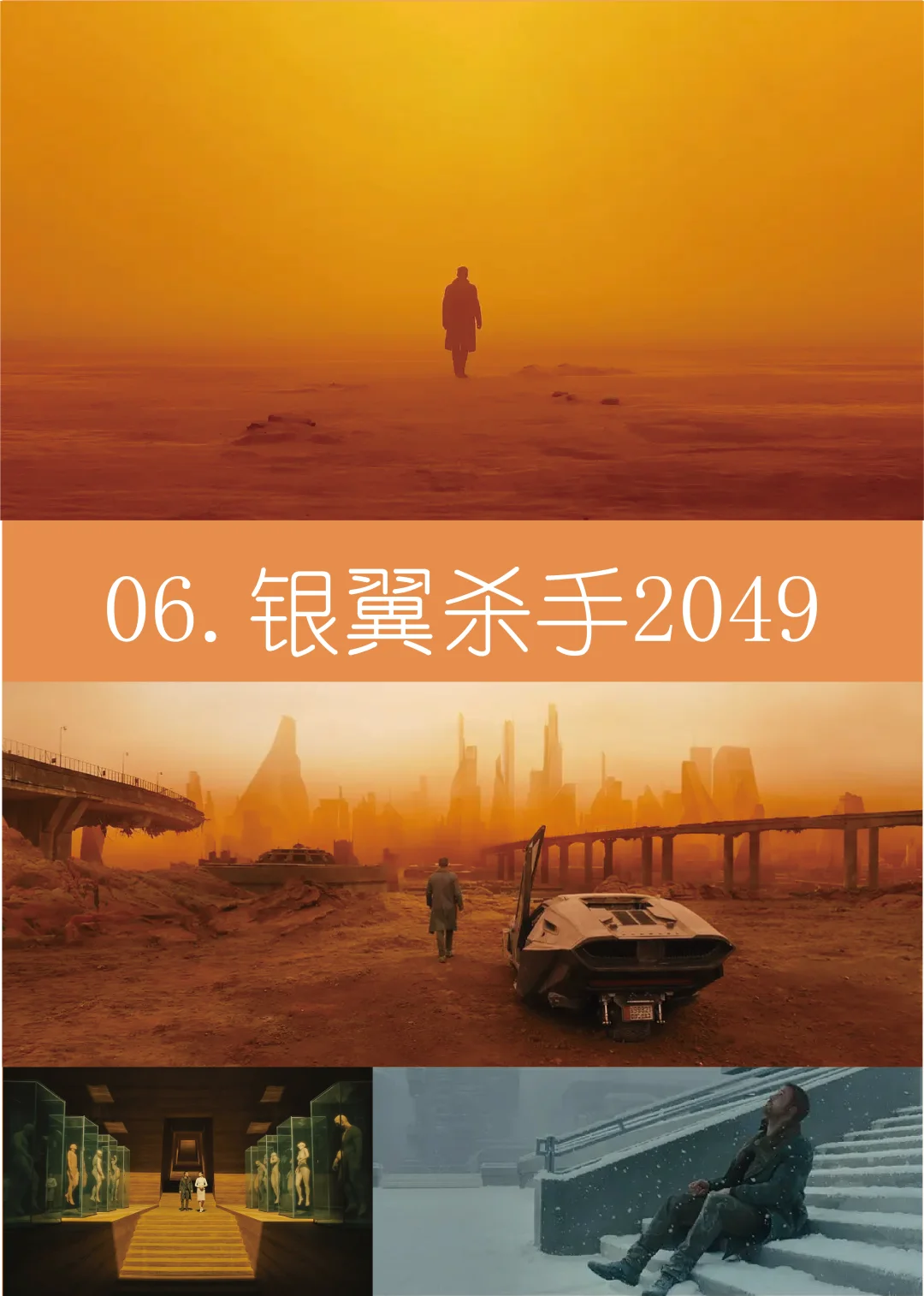 9.《银翼杀手2049》(2017)豆瓣8.3分:复制人K探寻真相、质疑身份,叙事克制,简洁构图、符号化色彩成为科幻电影美学标杆,用视觉完成深度叙事。