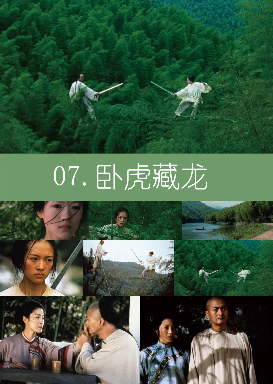 8.《卧虎藏龙》(2000)豆瓣8.4分:李安导演的武侠片,不只有精彩打斗,更有中国人的含蓄与克制,山水竹林的画面,把东方美学的温柔与力量拍得淋漓尽致。