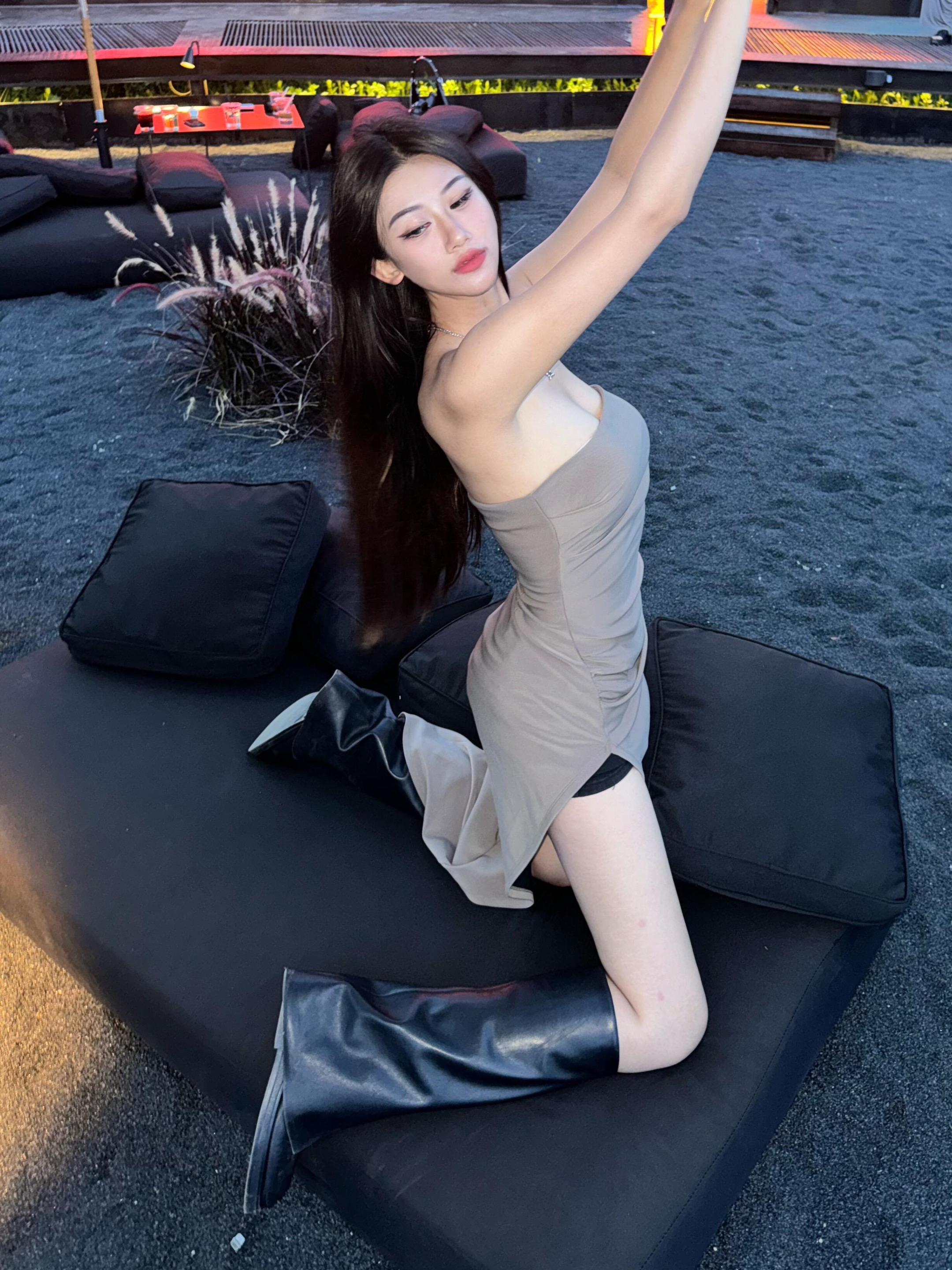 今日份辣妹营业💙 蓝格纹吊带裙自带清冷感 不规则裙摆+腿上绑带直接封...