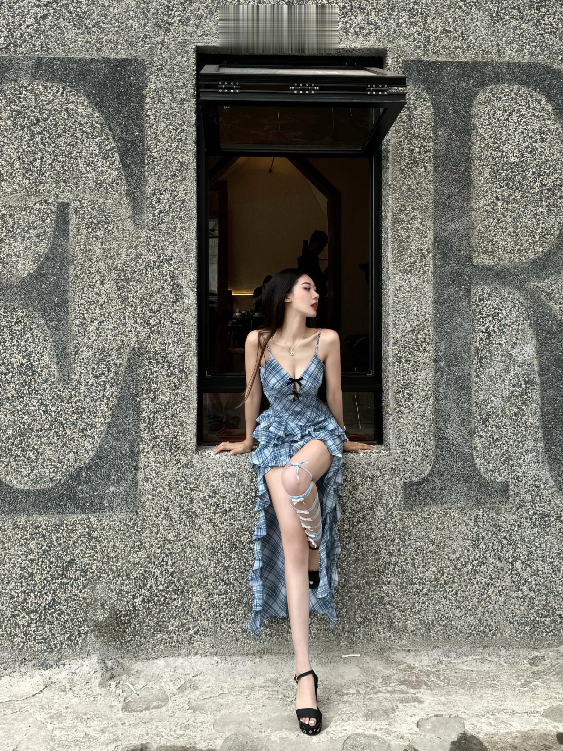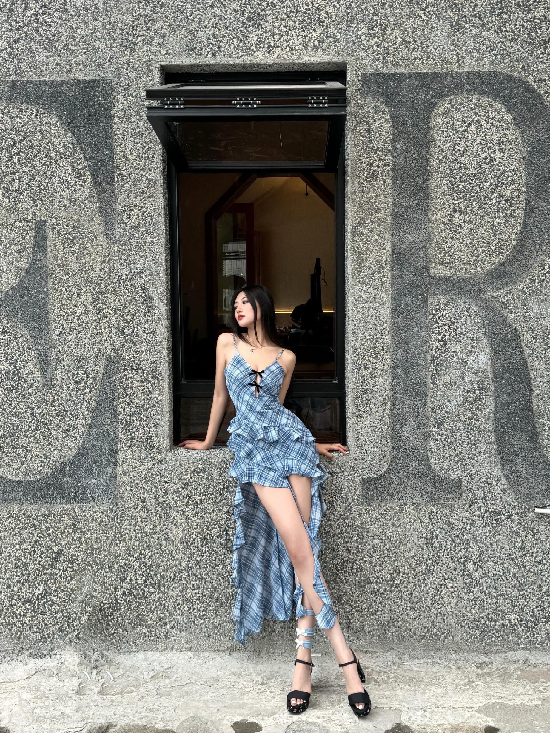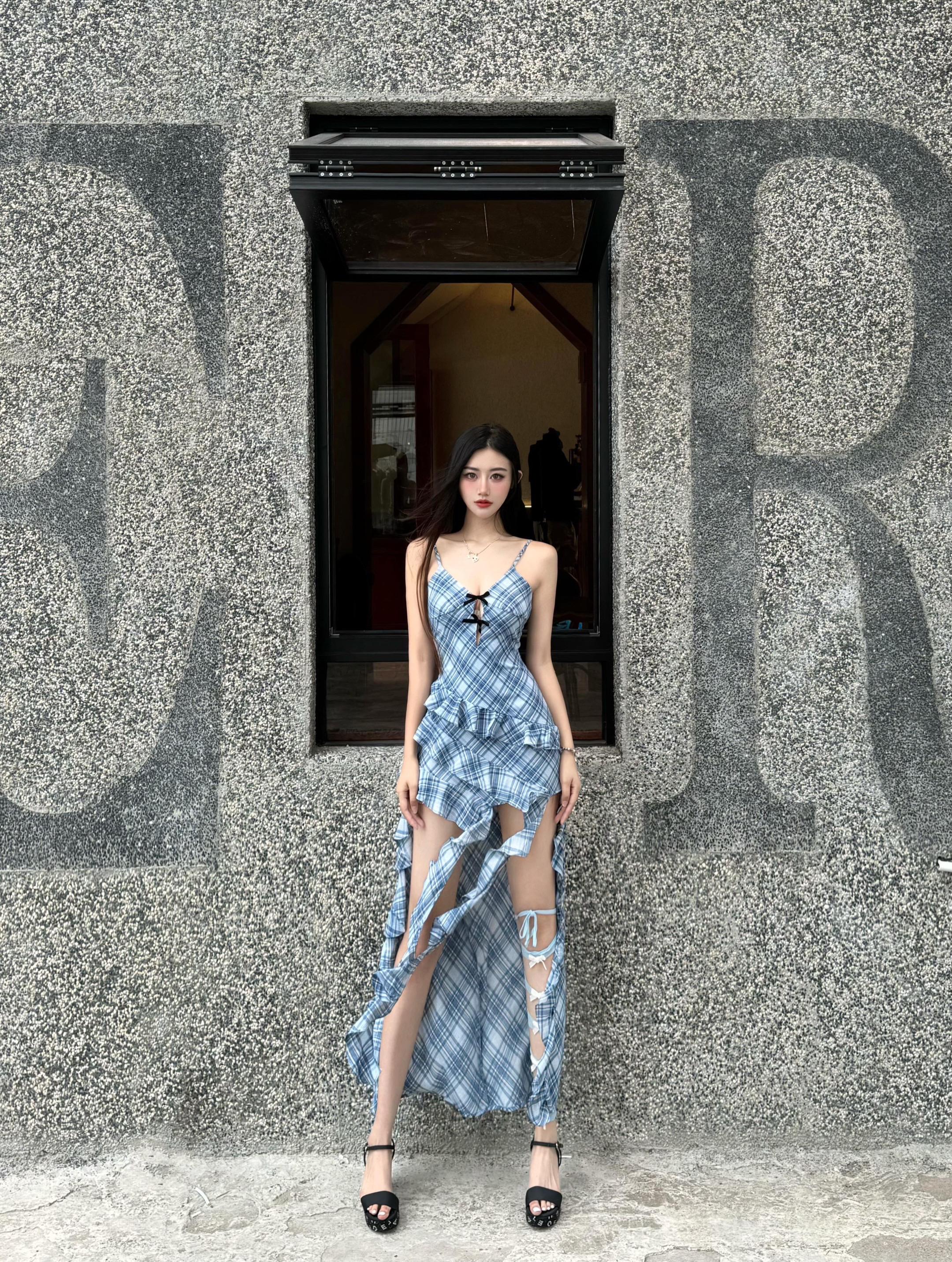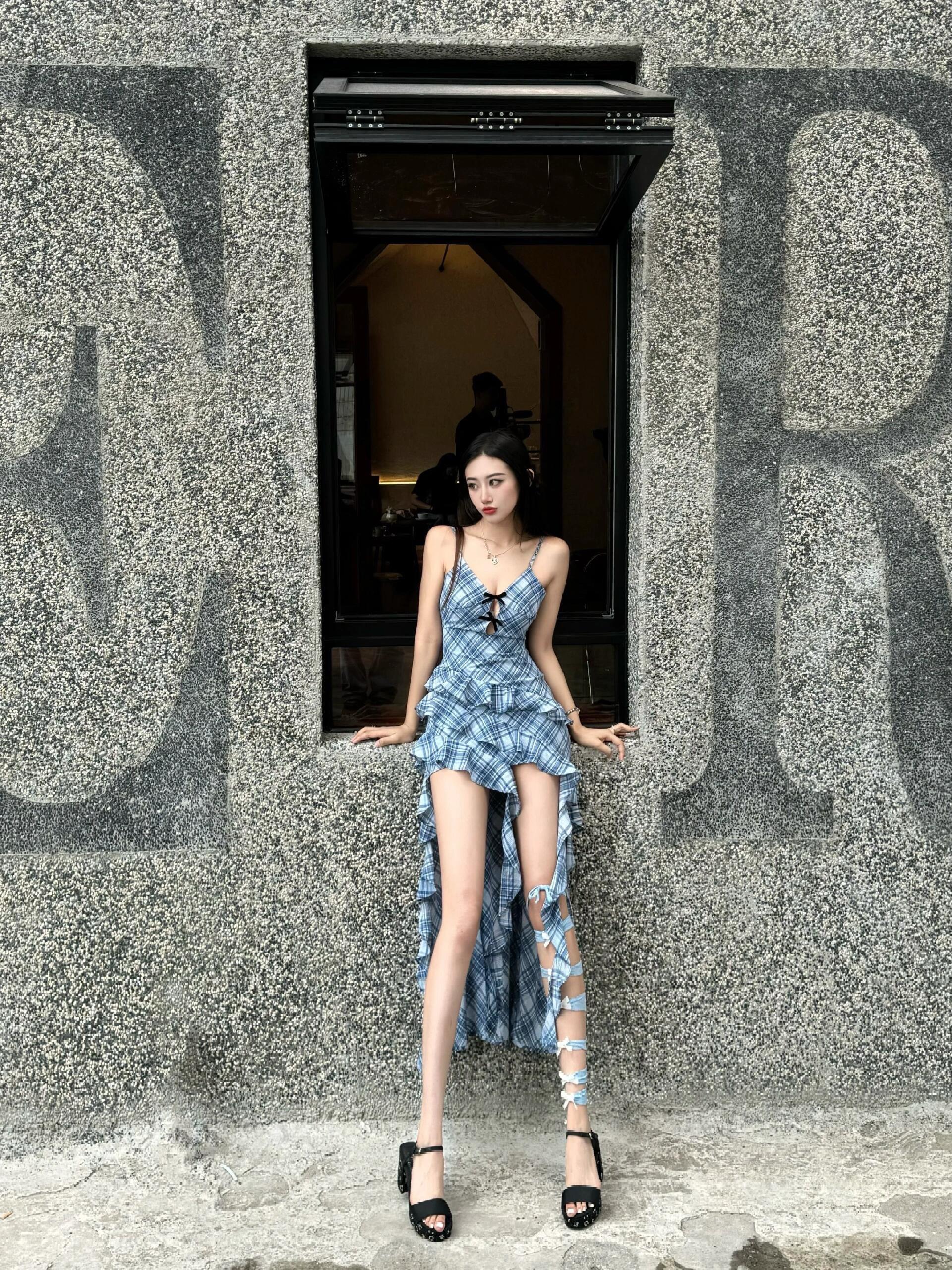 今日份辣妹营业💙 蓝格纹吊带裙自带清冷感 不规则裙摆+腿上绑带直接封神 随便一站都是画报感📸