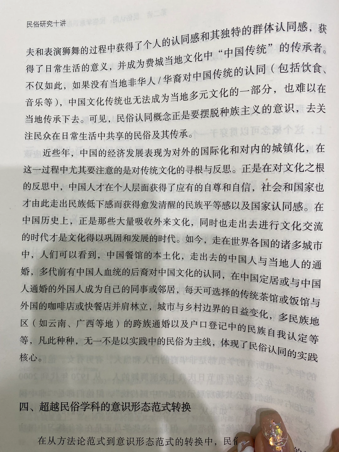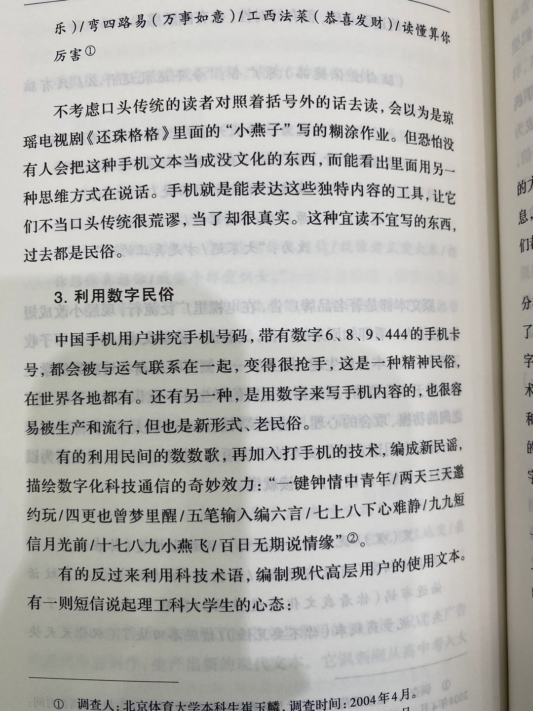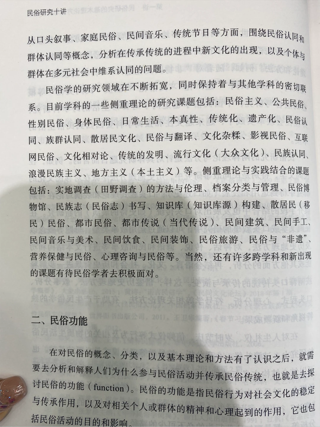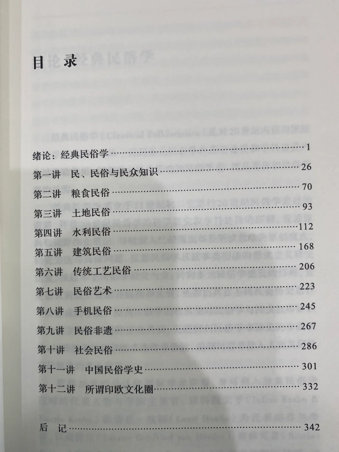 后面介绍的“手机民俗”比较新鲜,这本分专题来讲的。包括:民、民俗与民众知识,粮食民俗,土地民俗。水利民俗。建筑民俗,传统工艺民俗,民俗艺术,手机民俗,社会民俗,中国民俗学史,所谓印欧文化圈