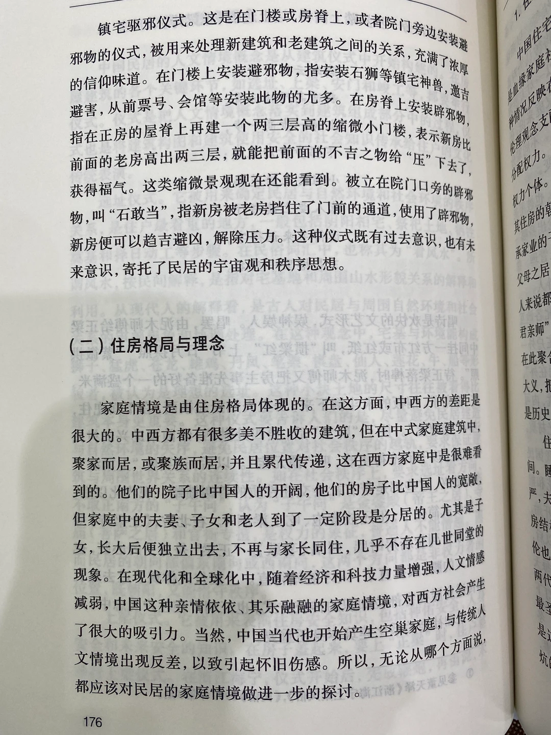 建房规划体现了空间观念,中国民居的人文情怀概念建立于建筑仪式:选址、上梁、安门和竣工等都有相关体现