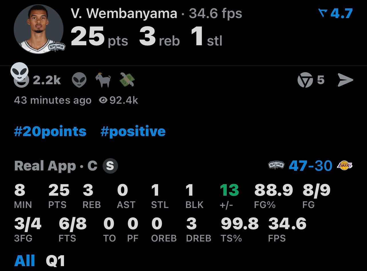 文班亚马第一节9中8拿到25分准备来说是8分钟拿到的马刺单节47分。。。