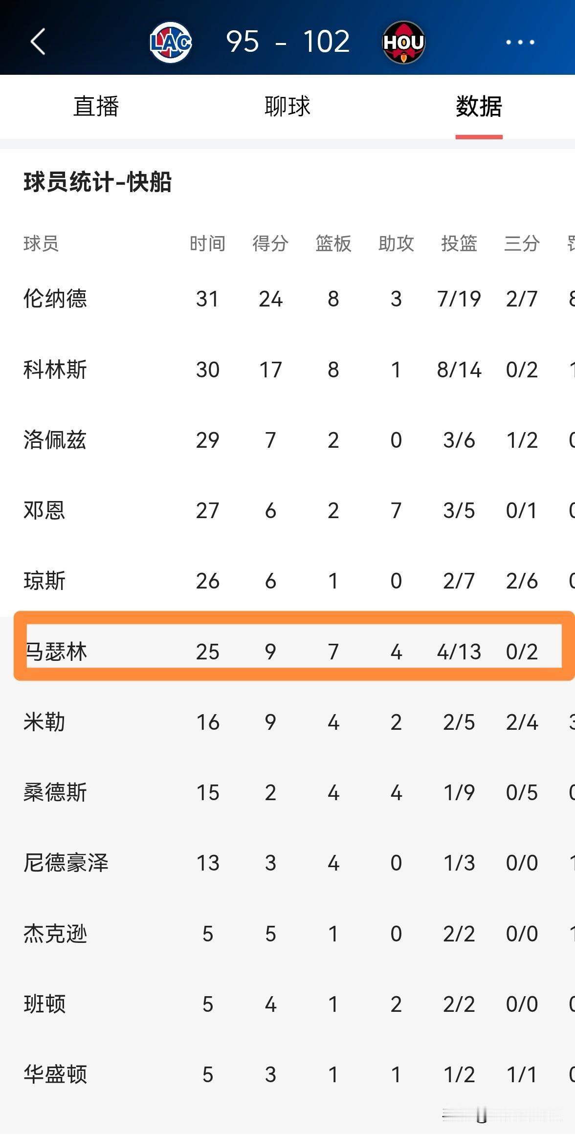 快船真是赚大发了!在今天快船客场以95:102输给火箭的比赛中,虽然新援马瑟林的投篮手感不佳,但是他在其他方面的表现真是足够出色。从马瑟林的快船首秀来看,我觉得快船得到了一名基石型的球员。 全场比赛下来,马瑟林替补出战25分钟,投篮13中4,其中三分球2中0、罚球1中1得到9分7篮板4助攻3抢断,没有出现任何的失误,他的场上正负值为+4。 毫不夸张的说,等马瑟林完全适应快船的体系以后,我相信马瑟林会给球队提供巨大的帮助。