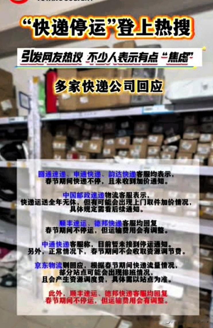 🔥紧急辟谣!2026春节快递全网不停运!放心寄年货📦 主流快递全部官宣:春节不打烊! 国家邮政局发话:严禁擅自停运! 只有偏远乡镇网点弹性调时间,没有全停这回事! ⚠️两个重要提醒: 1️⃣ 顺丰/京东/德邦等,高峰期收合规资源调节费 2️⃣ 天气+运力调整,时效可能稍慢,急件早寄 💪快递小哥加班有补贴,安心收寄不打烊! 别再信停运谣言啦~ 春节快递 停运快递 春节放快递 物流停运 物流停运表 中国快递排行榜 春节快运
