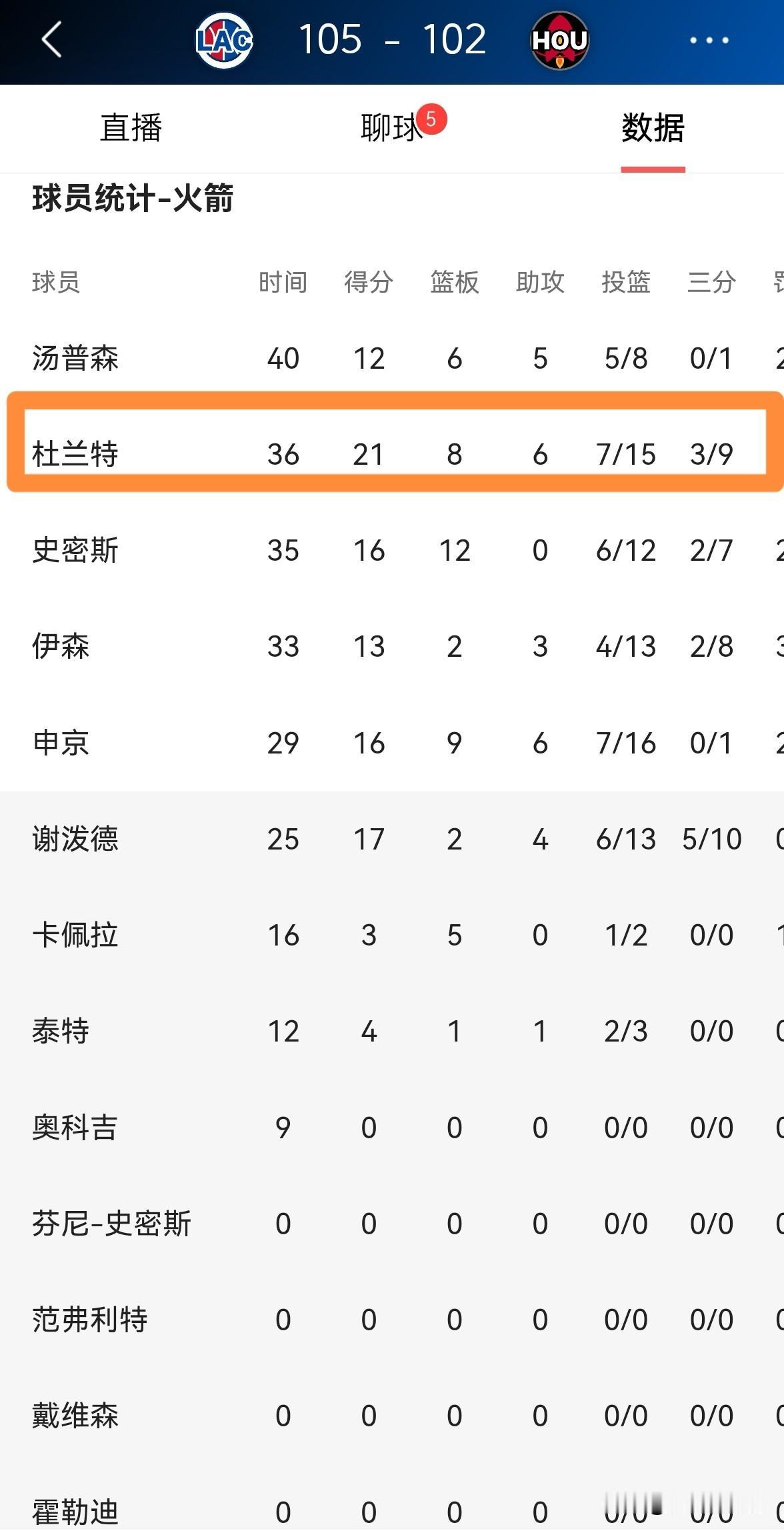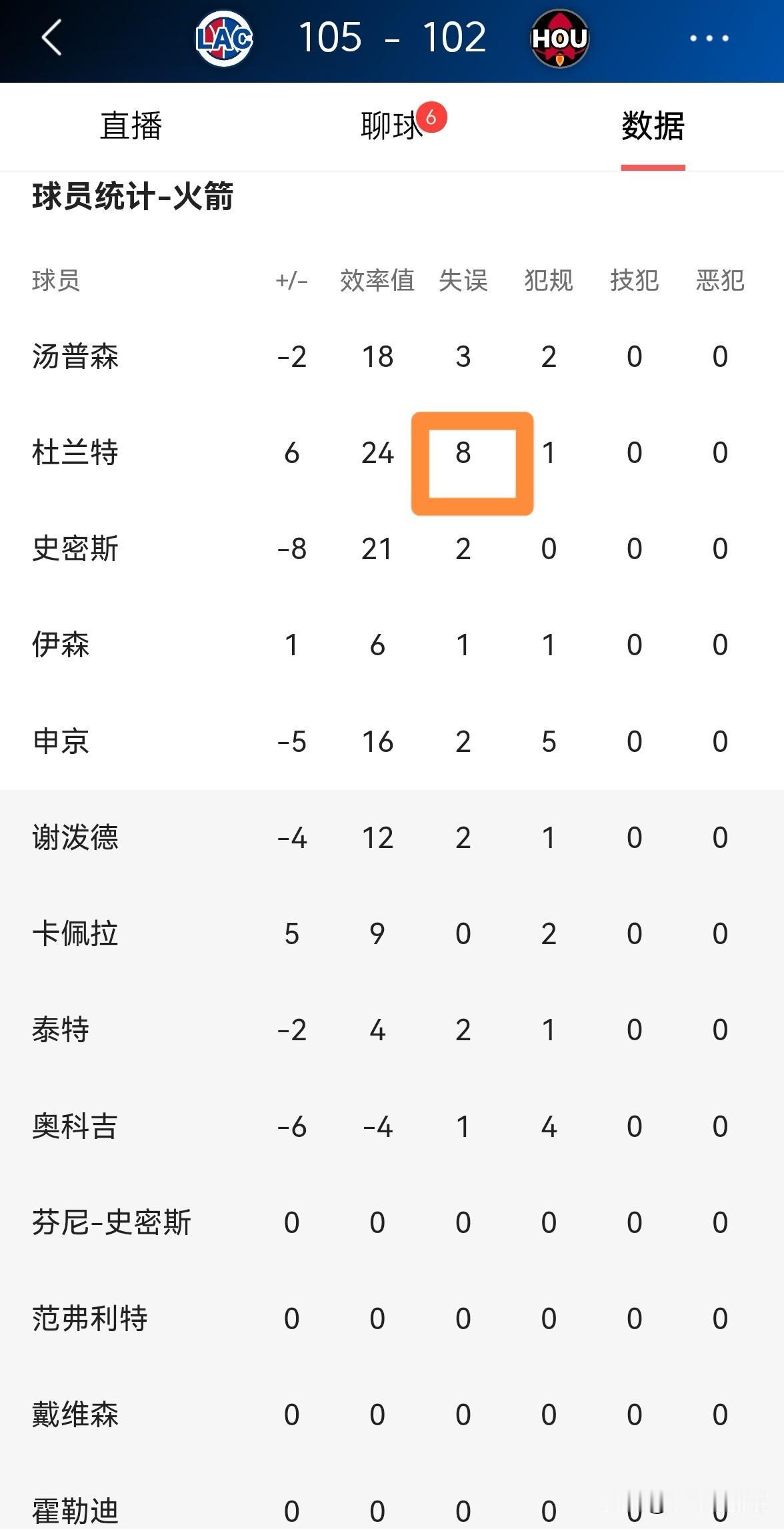 火箭超级巨星杜兰特真是球队的祸水!在今天火箭主场以102:105不敌快船的比赛中,杜兰特疯狂的出现了8次失误,杜兰特必须要为球队的失利负全责。 全场比赛下来,杜兰特首发出战36分钟,投篮15中7,其中三分球9中3、罚球5中4得到21分8篮板6助攻,外加不可思议的8次失误。 实事求是的说,当火箭管理层看到杜兰特在本场比赛的表现后,他们一定特别后悔将杜兰特交易到球队中。