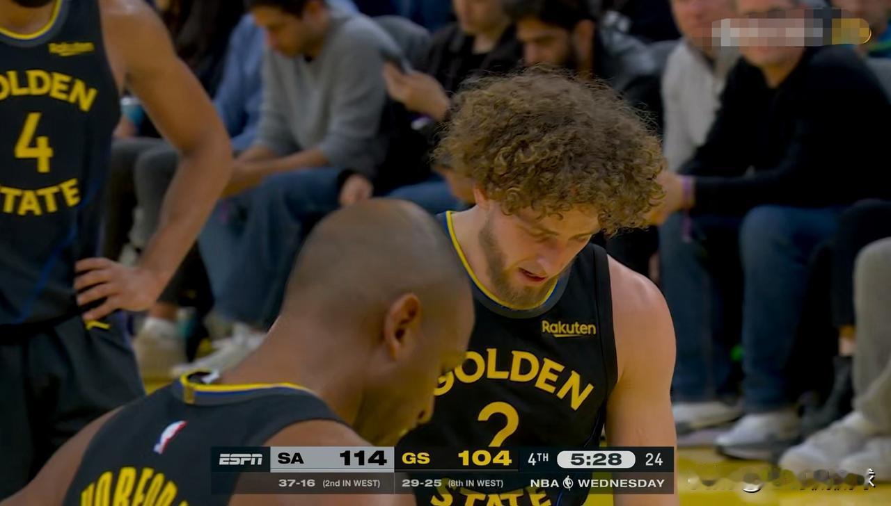 勇士超级球星库里真是愁容满面!在今天勇士主场迎战马刺的比赛中,当时比赛进行到了第四节的5分28秒,勇士以104:114落后于对手,赢球的希望已经变得非常渺茫。这个时候转播镜头给到了勇士的替补席,只见本场比赛因伤高挂免战牌的库里愁容满面的坐在场下,整个人看起来非常的忧愁和无奈。从库里的面部表情来看,他深知球队大势已去了。