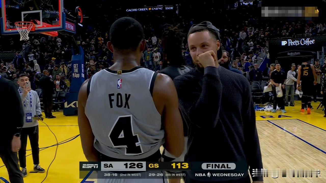勇士当家球星库里真是太有风度了!虽然今天勇士在主场以113:126输给了马刺,但是当比赛结束以后,此役因伤休战的库里依然面带微笑的和马刺球员拥抱致意,并且和马刺当家控卫福克斯进行了长时间的交流,尽显一名超级巨星的风采。 库里能够深受众多球迷喜爱不是没有原因的,库里属于典型的赢得起输得起的球员,他在给予对手尊重的同时自然赢得了对手的尊重。