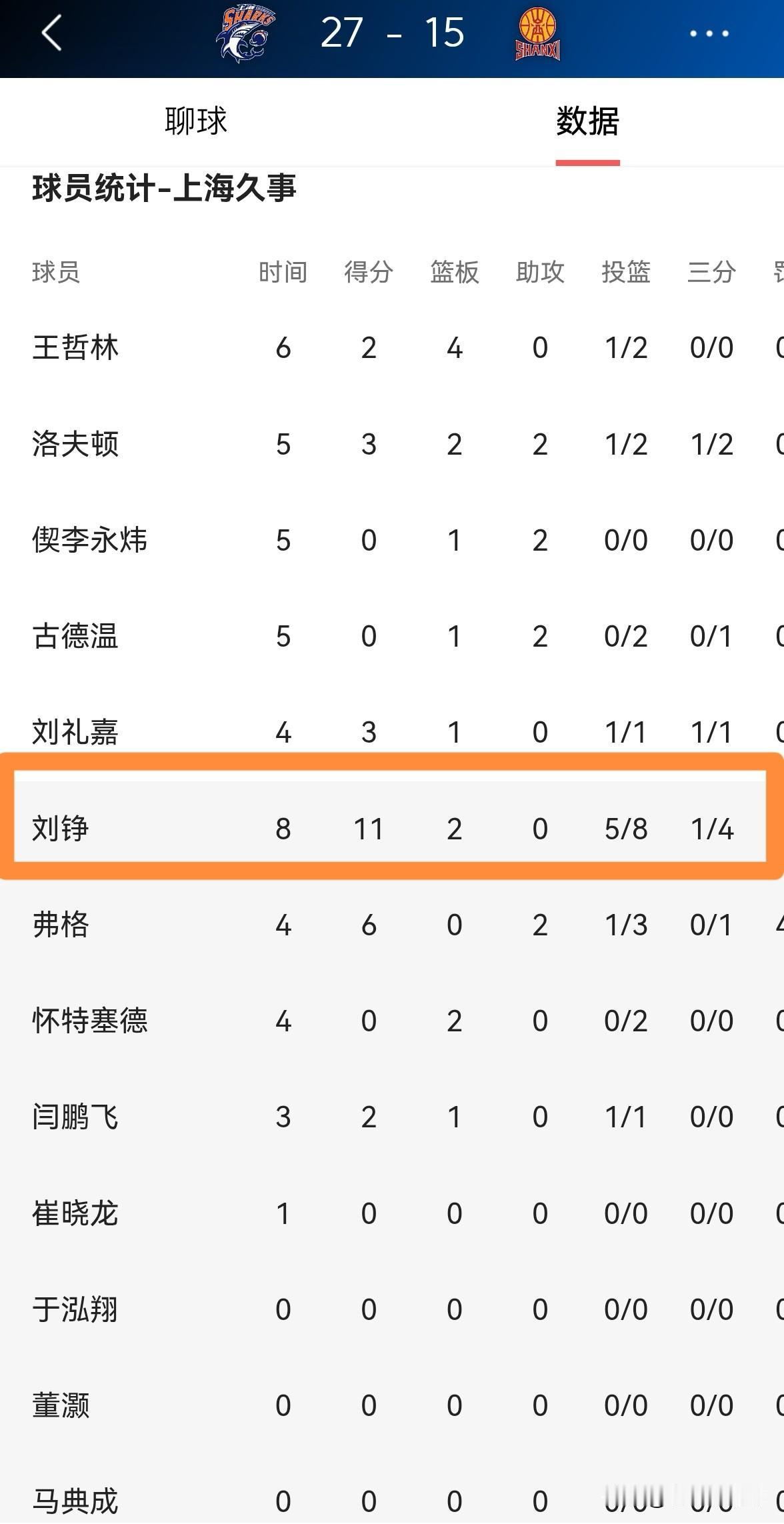 上海久事老将刘铮真是彻底的爆发了!在今天进行的上海久事和山西汾酒的CBA俱乐部杯决赛中,目前双方的第一节比赛已经结束,上海久事以27:15领先对手。在第一节比赛中,35岁的刘铮手感滚烫,他在替补出战的8分钟里,投篮8中5,其中三分球4中1砍下11分2篮板,他的场上正负值为全队最高的+10。 毫不夸张的说,上海久事之所以能够在第一节比赛结束时领先对手两位数,刘铮的爆发是最重要的原因。