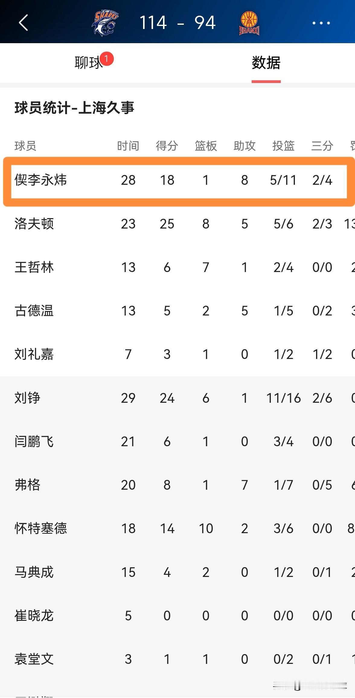我忍不住要怒赞上海久事新星偰李永炜!在今天上海久事以114:94轻取山西汾酒的CBA俱乐部杯决赛中,偰李永炜首发出战28分钟,投篮11中5,其中三分球4中2、罚球7中6得到18分,还有8助攻,他的场上正负值为+13。 本场比赛偰李永炜在进攻端的表现非常出色,他不仅能够自己得分,而且可以为队友创造出非常好的得分机会。