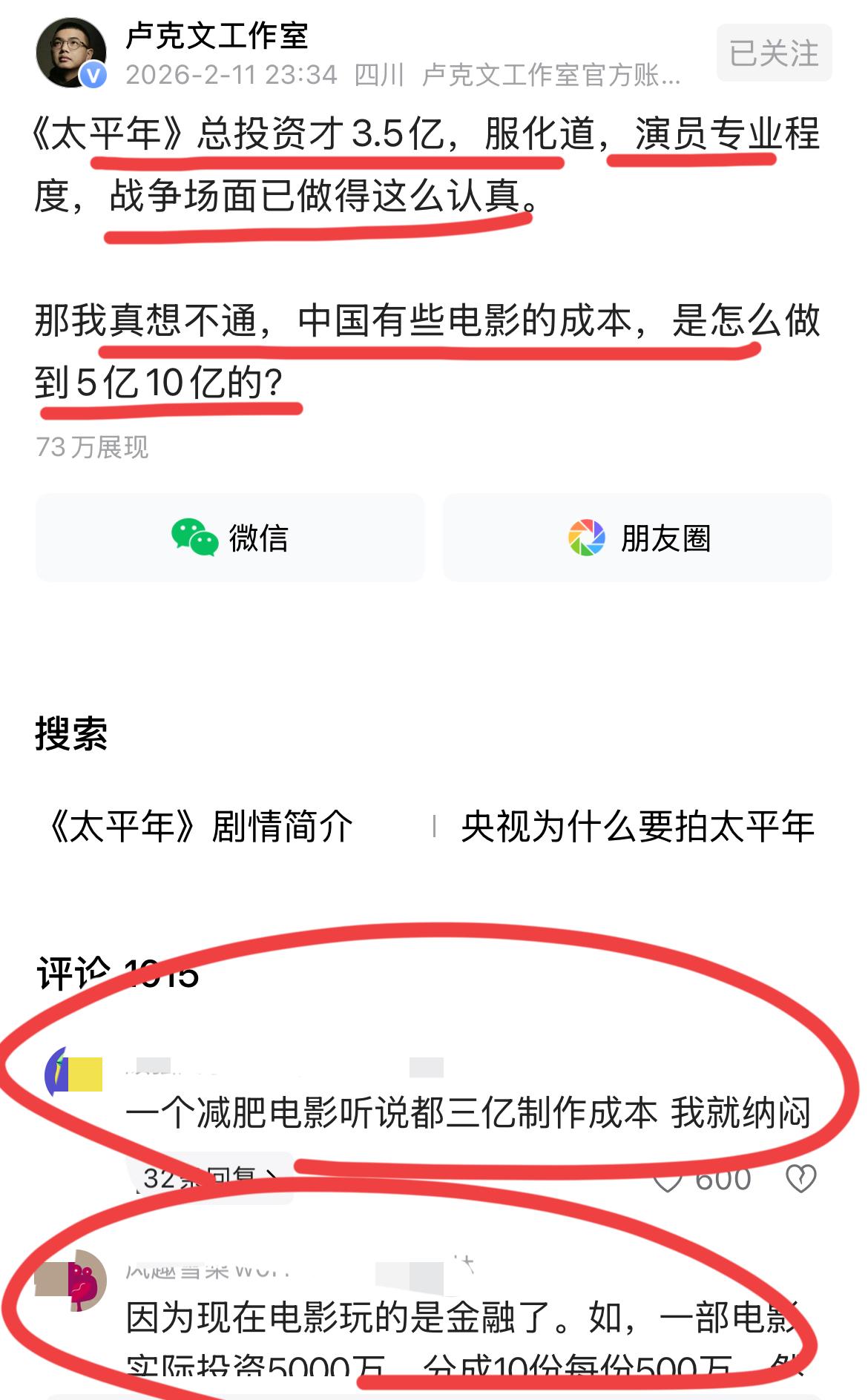 卢总得感叹,为啥有些电影的成本那么高?? 太平年,才花了3.5亿,但你看看,演员,服化道,太专业了,那种战争大场面,让人震惊!!简直太棒了~ 但为何有些垃圾电影,动不动都投资5亿10亿的,这钱花到哪里去了呢? 是的啊,这钱花到哪里去了呢? 网友说,一个减肥的电影,都花了3.5亿,有什么大惊小怪的!!也有人说,电影已经玩成金融了,你可懂? 嗯,这还不算完,本质可能是洗钱工具,要不然,每年那么多都没看过的电影挂在网上,投资人是冤大头?? 关于电影投资,你有什么看法呢?