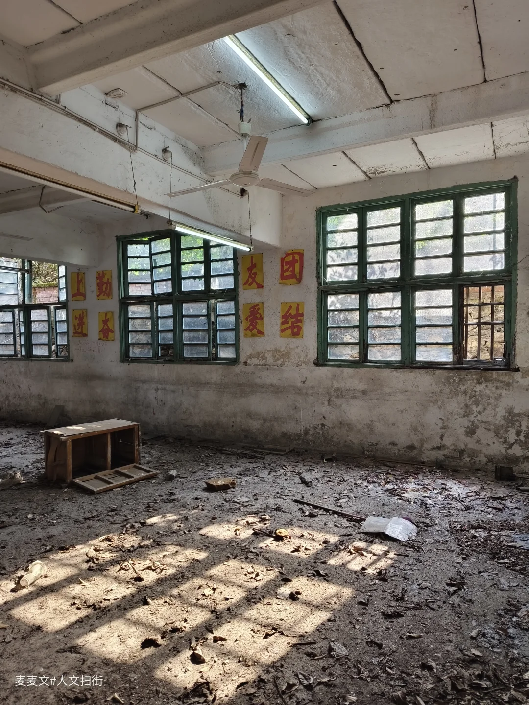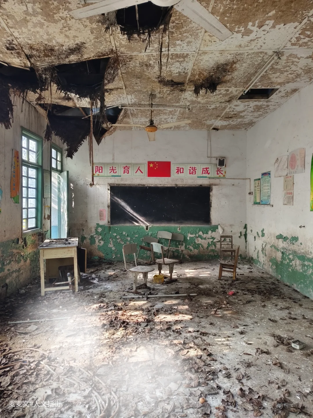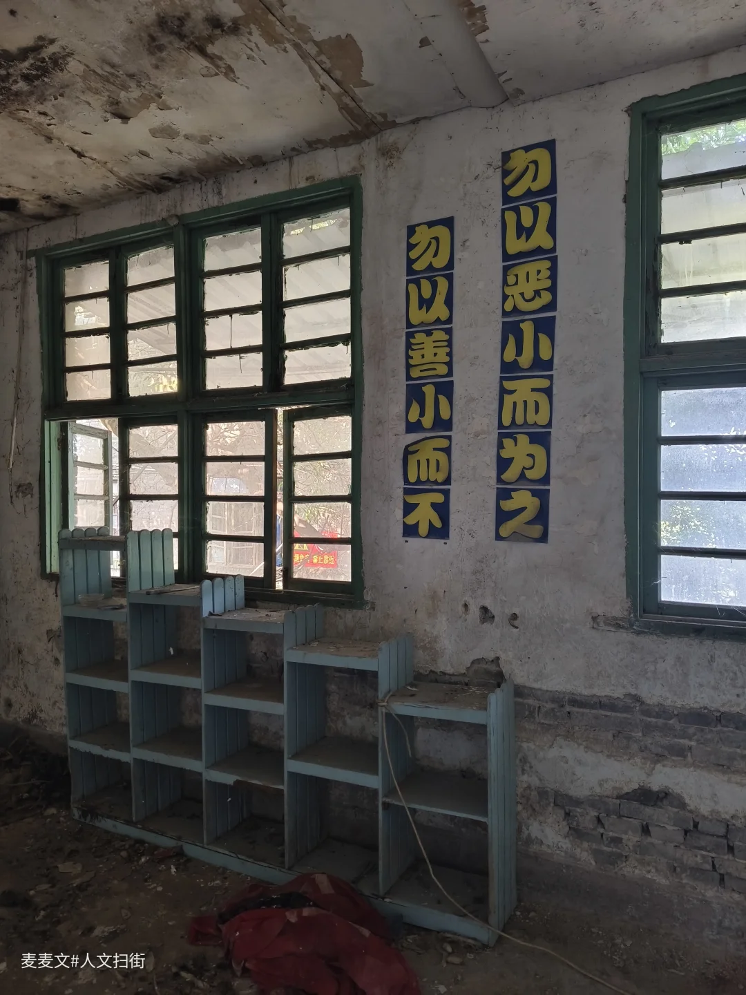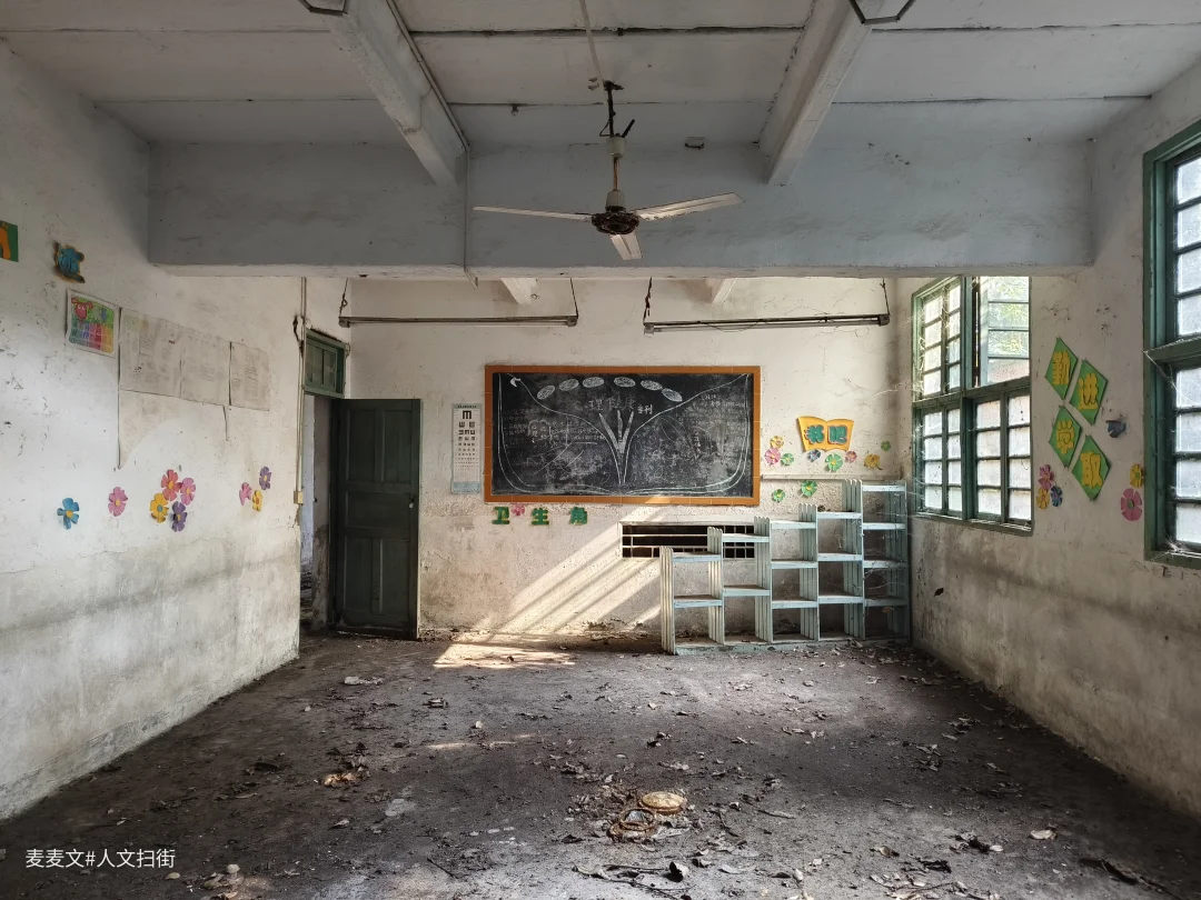 踏入原巴县县立25小学旧址,像闯入了一场被按下暂停键的童年。斑驳的墙皮裹着“阳光育人,和谐成长”的标语,绿色窗框还留着当年的油漆。光影洒在空荡荡的教室,黑板上的粉笔字依稀可辨,“学习园地”的彩色贴纸还贴在墙上,旧书架落满了灰尘。