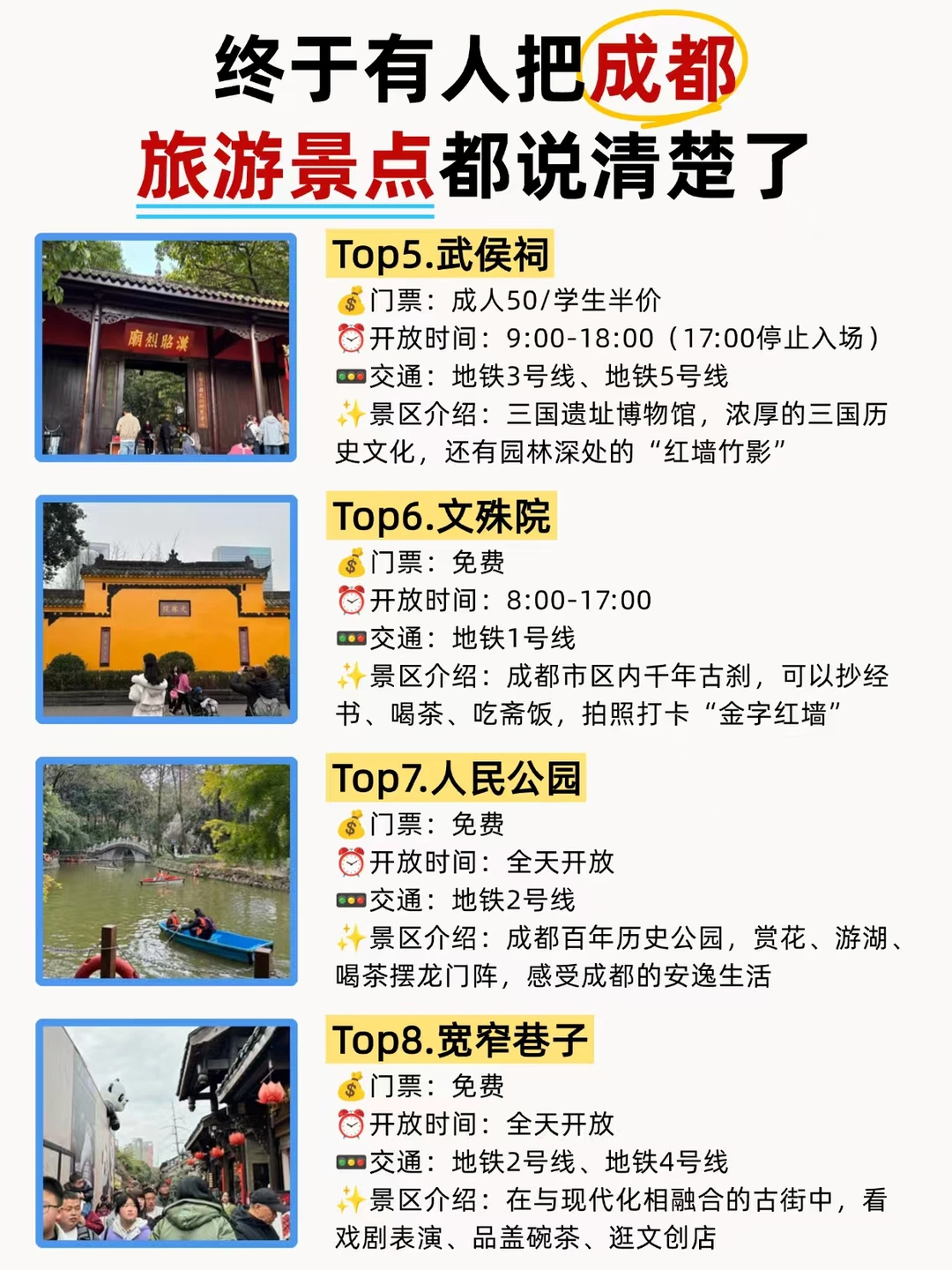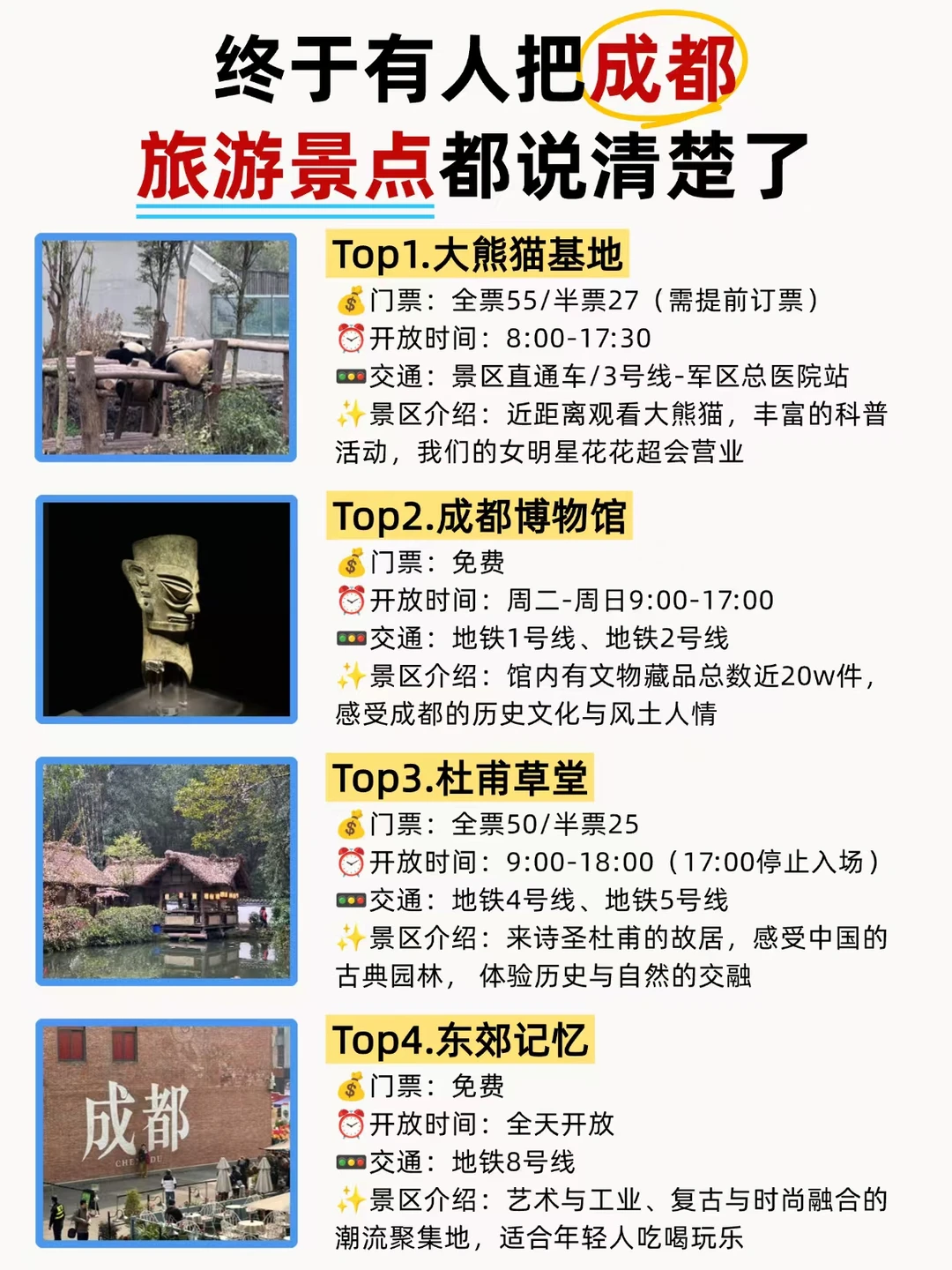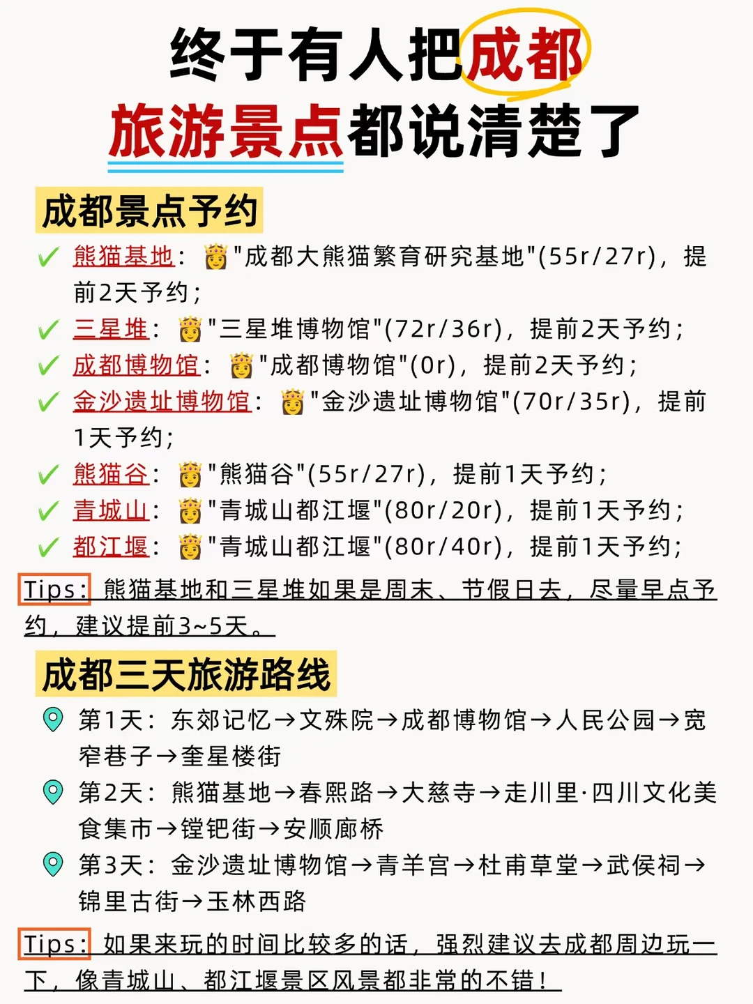 前段时间去了成都,真的被自己蠢到!为了拍照出片特意选了好些衣服,结果来了之后好些都穿不了,穿了去玩也难受😖……真的提醒大家一定要提前做攻略,出发前做足准备,关于成都旅游的各种信息已经整理好,分享给大家❤️