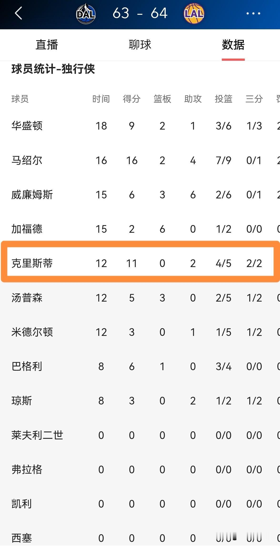 独行侠大将克里斯蒂真是非常的邪乎,他每当遇到湖人就会手感火热!在今天独行侠客场挑战湖人的比赛中,目前双方的上半场比赛已经结束,虽然独行侠以63:64落后对手,但是克里斯蒂的表现却非常的出色。 在前两节比赛中,克里斯蒂首发出战12分钟,投篮5中4,其中三分球2中2、罚球2中1非常高效的砍下11分,还有2助攻,没有出现任何的失误。 自从克里斯蒂被湖人交易到独行侠之后,克里斯蒂每次打湖人就会爆发,你说邪乎不邪乎?