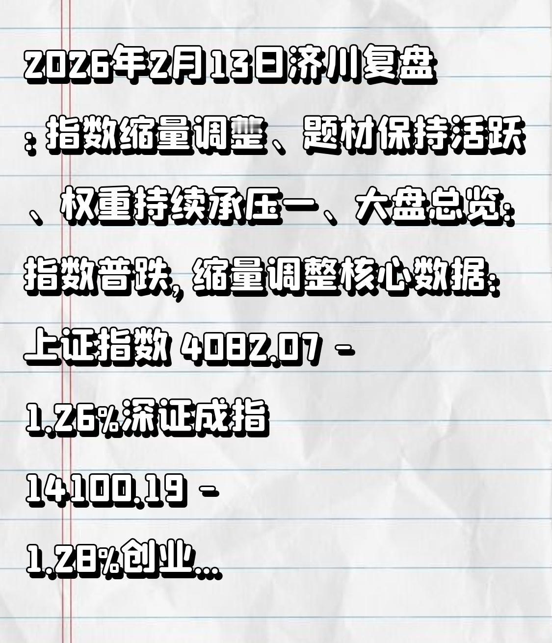 2026年2月13日济川复盘:指数缩量调整、题材保持活跃、权重持续承压 一、大盘总览:指数普跌,缩量调整 核心数据: 上证指数 4082.07 -1.26% 深证成指 14100.19 -1.28% 创业板指 3275.96 -1.57% 两市成交 约1.98万亿(较前一日缩量约1600亿) 涨跌家数 1540:3829(下跌家数近3800家) 涨停家数 约46家,跌停家数未明显放大 结论: 指数层面是普跌+缩量,市场情绪偏谨慎; 但并非系统性恐慌,结构性特征非常明显 二、板块特征:防御与科技并存,轮动极快 1. 涨幅居前的行业板块 板块 涨幅 领涨股 特征 船舶制造 +3.66% 亚星锚链 10.04% 全天最强,有事件+业绩预期 航天航空 +2.21% 安达维尔 19.99% 军工细分,弹性较大 综合行业 +0.63% 国安股份 10.06% 小盘股带动 电机/计算机设备 微红 方正电机、汉邦高科 部分科技细分仍活跃 2. 跌幅居前的板块 银行:青岛银行 -1.99%,农业银行 -1.51% 光伏设备、小金属、贵金属、能源金属、采掘、钢铁等均跌幅明显 食品饮料:蛇年至今-1.32%,仍为唯二负收益板块之一 结论: 权重股、周期股、传统蓝筹是当天指数下跌的主要拖累; 军工、船舶、部分AI/机器人概念仍在活跃,资金并未完全离场。 三、概念与题材:机器人、半导体、军工仍有韧性 最强板块: 板块 涨跌幅 涨停家数 备注 机器人概念 -0.16% 4家 站稳5日线6天 半导体概念 -0.21% 4家 连续活跃 军工 -0.15% 6家 汉邦高科20cm 新能源车 -0.24% 11家 涨停数最多 当日领涨题材: 通用航空 +1.32%(天汽模) 数字水印 +1.27%(汉邦高科 20cm) 全息技术 +1.05%(风语筑) MLOps概念 +0.84%(绿盟科技) 结论: 题材并未退潮,只是从高位板块向低位、新方向扩散; 机器人、半导体仍是资金核心战场,强度维持高位。 四、资金面:行业分化,科技仍吸金 板块主力净流入(行业): 半导体 +17.30亿 消费电子 +10.27亿 船舶制造 +7.98亿 板块主力净流入(概念): 存储芯片 42.15亿 冷链物流 18.96亿 智慧政务 18.32亿 流出端: 互联网服务、光伏、有色金属等流出居前 机器人概念虽强度第一,但净流出-46.1亿(分歧加大) 结论: 资金仍在科技内部轮动,从高位AI向存储、半导体设备、军工科技迁移; 机器人板块内部出现分化,部分资金兑现。 五、连板与龙头:高度压缩,断层明显 连板天梯(02-13): 5板:掌阅科技(AI短剧,已发风险提示) 4板:ST金鸿、*ST万方 3板:金时科技、豫能控股、美邦股份 2板:汉缆股份、ST京蓝等 风险提示: 掌阅科技:AI短剧业务收入占比不到1% 宏和科技:股价短期涨幅较大 嘉美包装:魔法原子资本运作独立于上市公司 结论: 连板高度压缩至5板,且已发异动公告; 纯情绪博弈标的开始分歧,市场更偏好有逻辑支撑的趋势股。 六、机构观点与宏观线索 1. 中信证券: AI CAPEX仍是2026H1较确定主线 关注ROI验证、科技巨头指引、AI应用落地 2. 华泰证券: 储能、电力市场化、高质量出海三条主线 3. 中银证券: 房地产政策拐点(Q1末) 与基本面拐点(Q4) 4. 外资动向: 瑞银、高盛Q4减持美股科技巨头 市场对巨额AI开支的回报率开始产生疑虑 结论: 内外资对科技股的分歧加大,但国内机构仍看好AI算力主线; 宏观层面未见系统性风险,仍是结构性调仓。 七、蛇年至今(2026.2.13)行业表现回顾 涨幅前五: 1. 有色金属 +112.63% 2. 综合 +90.83% 3. 通信 +90.40% 4. 电子 +60.74% 5. 电力设备 +58.32% 唯二下跌: 银行 -0.09% 食品饮料 -1.32% 结论: 科技+周期双主线贯穿蛇年开局; 传统防御性板块(银行、消费)被明显抛弃。 八、综合复盘结论 当日定性: 指数缩量调整,题材继续轮动,权重承压,科技分歧,连板退潮。 核心矛盾: 市场在高位科技与低位权重之间犹豫; 资金仍在科技内部,但从AI硬件向军工、存储、机器人扩散; 指数层面未破位,仍处于箱体震荡格局。 次日关注点: 1. 船舶、航天航空能否持续。 2. 机器人、半导体是否修复资金流出。 3. 银行、周期是否止跌。 4. 连板股亏钱效应是否扩散。