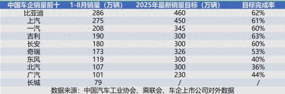 全年销量目标冲刺到关键节点!比亚迪62%销量目标达成率凸显行业韧性! 2025 年中国汽车市场结构性变革持续深化,乘联会最新数据显示,8 月全国新能源市场零售渗透率攀升至 55.3%,创月度新高且连续六个月超 50%。在此趋势下,头部车企 1-8 月最新销量及目标完成率呈现显著分化,新能源转型成效成为决定企业市场表现的核心因素。 从今年1-8月份销量前十的中国车企数据来看,行业头部阵营格局清晰。比亚迪以 286 万辆的累计销量稳居榜首,在25年度460万辆最新销量目标中完成率达 62%,在新能源赛道持续领跑。 吉利汽车表现亮眼,190 万辆的销量实现 300 万辆年度目标的 63%,完成率位列前十车企首位;上汽、一汽、长安分别以 275 万辆、208 万辆、180 万辆销量,达成各自年度最新销量目标的 61%、60%、60%,凭借全品类布局与新能源产品落地,维持规模优势。 值得关注的是,新能源业务表现成为车企目标完成率的关键影响因素。例如比亚迪依托 “技术平权 + 海外扩张” 战略,1-8 月新能源汽车出口达 63.07 万辆,超 2024 年全年水平,同时凭借 “天神之眼” 辅助驾驶系统、超级 e 平台等技术创新巩固优势。 随着 “金九银十” 传统销售旺季到来,第四季度也是各车企冲刺全年目标的关键期,体系能力、技术实力与全球化布局的综合竞争力,将直接决定企业市场地位,而新能源业务的推进成效,仍将是影响行业格局的重要变量。