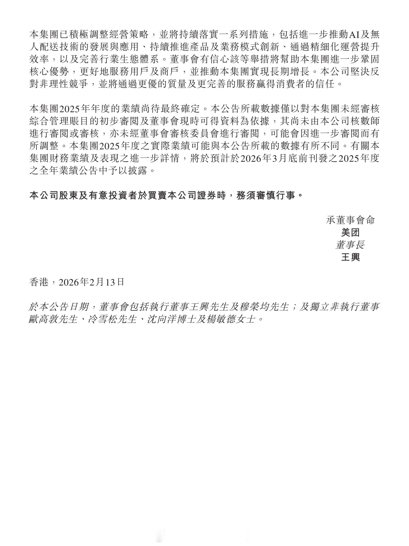 美团今晚在港交所发布盈利预警:公司预计 2025 年度将由盈转亏,全年录得净亏损约人民币 233 亿元至 243 亿元。