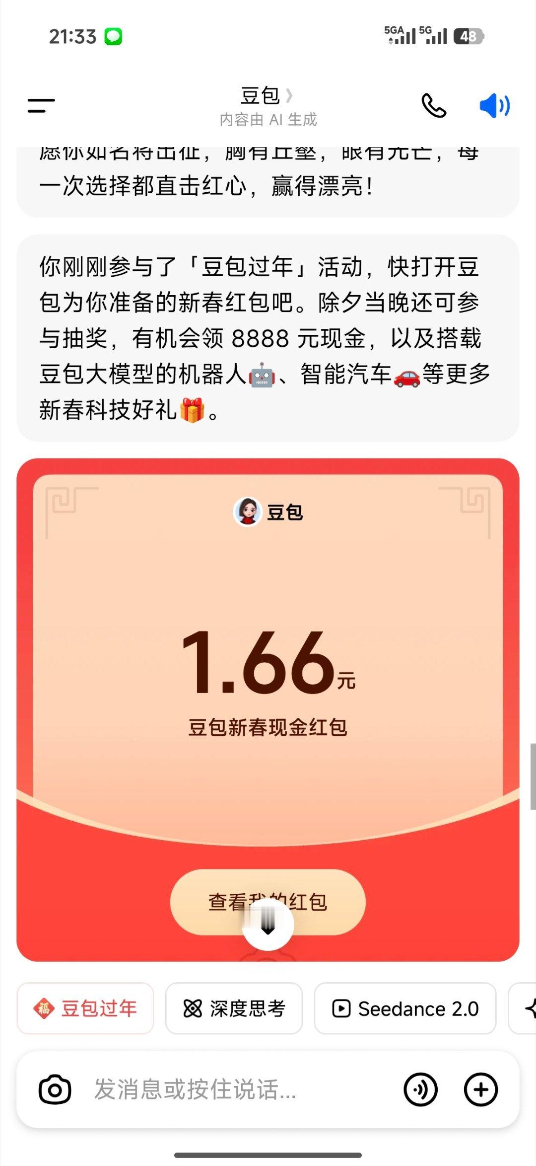 豆包红包你刚刚参与了「豆包过年」活动,快打开豆包为你准备的新春红包吧。除夕当晚还可参与抽奖,有机会领 8888 元现金,以及搭载豆包大模型的机器人🤖、智能汽车🚗等更多新春科技好礼🎁。