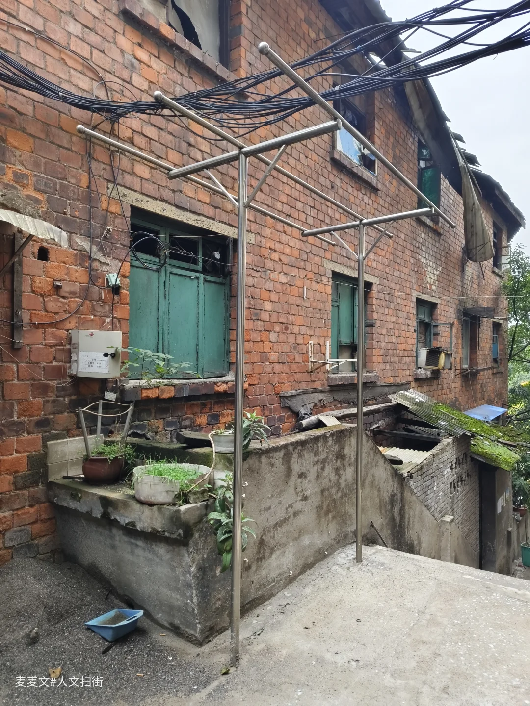 踩着王家坝路边潮湿的石阶往上走,重庆工业泵厂家属区的烟火气与工业感扑面而来。红砖墙爬满了青苔,绿色铁窗锈迹斑斑,晾衣杆上还挂着住户的衣物。 斑驳的木门上褪色的春联和福字,还留着当年的温度。逼仄的巷道里,老藤椅和电线交错纵横,像一张细密的网,兜住了几代泵厂人的生活。 这里曾是重庆工业时代的缩影,机器轰鸣的厂房与家属院仅一墙之隔。如今厂房沉寂,但老楼仍在,每一阶石阶都印着家属区的日常,每一扇窗都藏着泵厂人的故事。