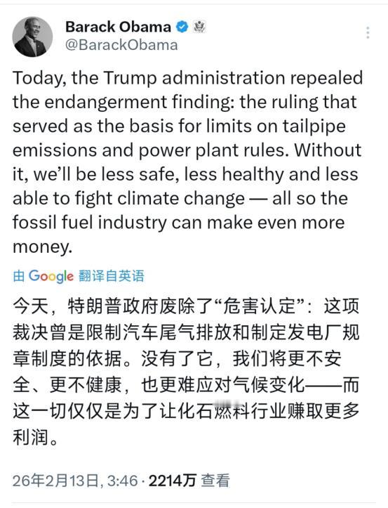 美国前总统奥巴马今天(北京时间2月13日)发文写道:“今天,特朗普政府废除了‘危害认定’:这项裁决曾是限制汽车尾气排放和制定发电厂规章制度的依据。没有了它,我们将更不安全,更不健康,也更难应对气候变化而这一切仅仅是为了让化石燃料行业赚取更多利润。” 这两天,美国前总统奥巴马又和特朗普杠上了。起因是2月12日,特朗普正式宣布撤销美国环境保护署于2009年发布的“温室气体危害认定”。这一决定迅速引发前总统奥巴马的强烈回应。 2月13日,奥巴马在社交媒体上直接开火,说特朗普政府废掉了一项关键的气候法规,等于让美国“更不安全、更不健康”。 要知道,这一认定是2009年奥巴马政府赋予环保署监管碳排放的法定权力,随后一系列针对汽车、电厂的减排规则才得以出台。可以说,过去十多年美国在气候领域的行动,几乎都建立在这个法律基石之上。 如今,特朗普一纸命令将其撤销,不仅让过去十余年制定的汽车尾气、电厂排放等环保规则瞬间失去法律依据,也让联邦政府今后再想管温室气体,连最基本的执法权都没有了。 当然,特朗普那边觉得自己有理。他们的说法很接地气:以前那些环保规定太狠了,搞得车厂成本高,老百姓买车也贵。废除这个认定,能给企业松绑,帮大家省钱。 环保署还专门算了笔账,说这能省下上万亿美元的“监管成本”,每辆新车能便宜两千多美元。 内政部长甚至抛出一个听起来更直白的观点:二氧化碳算什么污染物?人呼吸还吐二氧化碳呢。 这话老百姓听着确实舒服了,毕竟谁不想买车便宜点?但问题是,奥巴马在声明里一针见血的指出:这根本不是为老百姓着想,而是为了让化石燃料行业赚得更多。 表面上看是帮老百姓省钱,但真正拍手叫好的其实是石油、煤炭这些传统能源大佬。因为那些住在工厂边上、每天吸着废气的人,他们的健康根本无人买单,更无人在意。 其实,这次的政治对轰背后,是美国两党十几年的恩怨。原本执行了17年的法规被特朗普政府用一纸公文给废了,这已经不是美国第一次在环保这件事上反复横跳了。 现在加州那边已经准备开打官司。作为全美环保最激进的州,加州一向有自己的排放标准,联邦政府想往后缩,加州偏要往前冲。 这一来一回,最头疼的是汽车制造商。到底是造便宜但排放高的车,还是继续为加州搞一套高标准?两头不是人。 更讽刺的是,就在特朗普政府宣布这决定的前几天,欧洲那边刚发了个数据:全球平均气温比工业革命前已经高了1.4度,离1.5度的警戒线只差一点点。 美国作为历史上排碳最多的国家,这时候选择从法律上否定气候监管的必要性,怎么看都像是“好人”该做的事。 说到底,这场风波表面上是奥巴马和特朗普的口水仗,实则是一场关于利益的博弈。一边是化石能源巨头想保住传统饭碗,一边是普通人的健康和未来的气候风险。 短期内,油价、车价、企业成本这些账算得明明白白,老百姓也容易站队。但长期看,极端天气越来越频繁,风暴、山火、干旱轮番上演,这笔账,终究会由全世界人来买单。 对此你有什么看法?欢迎在评论区留言讨论。 文|墨海 编辑|史叔