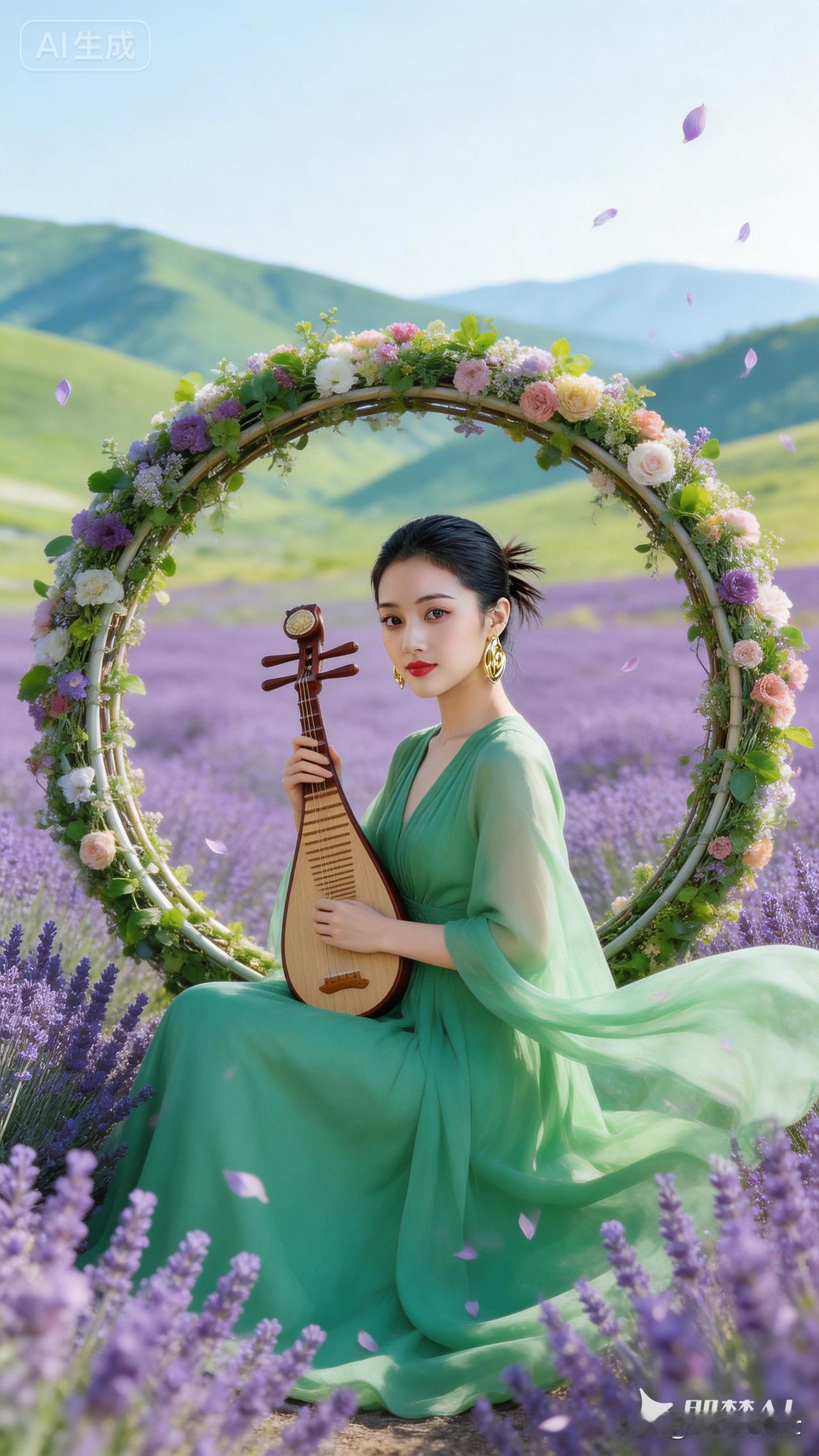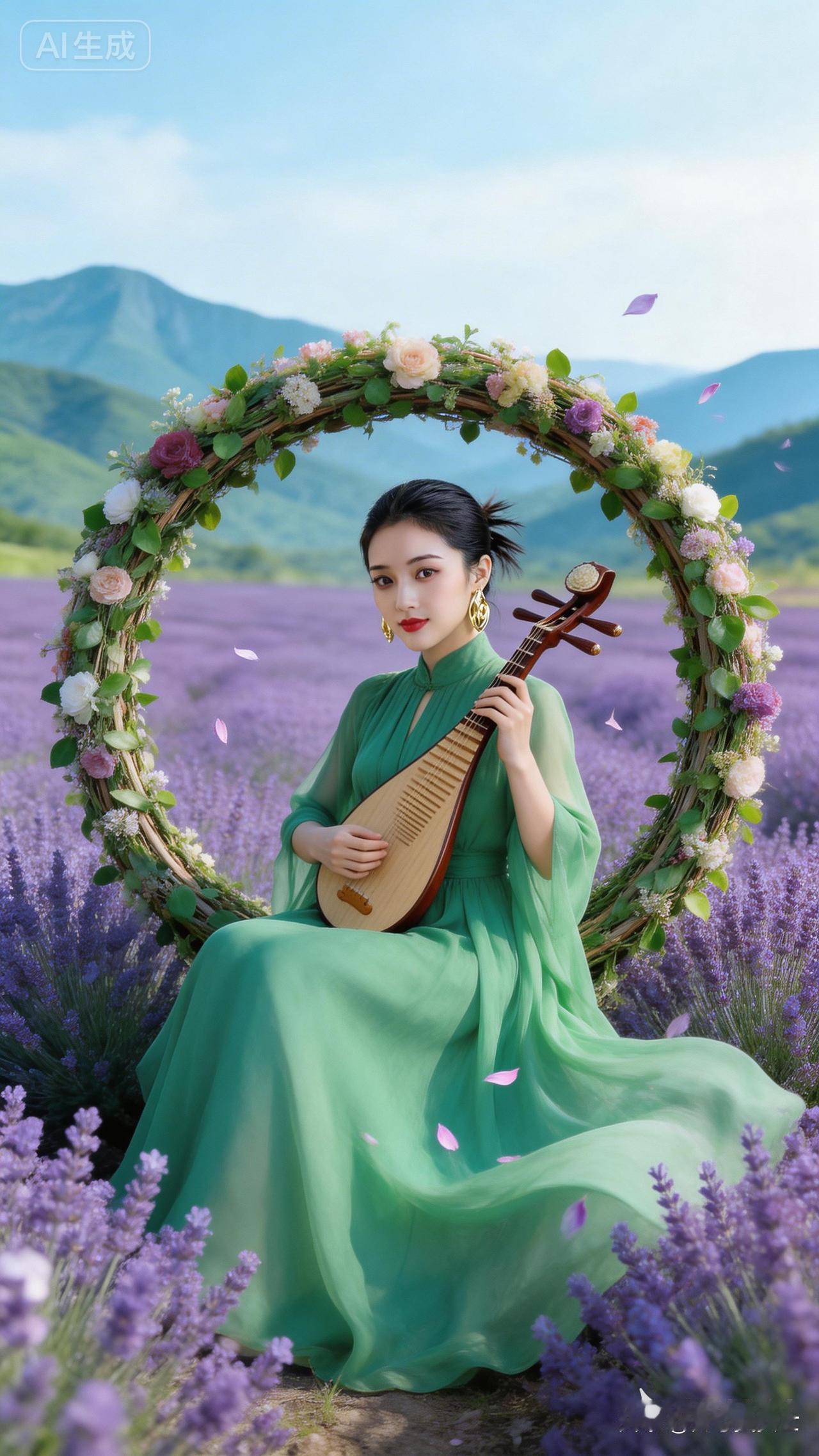 绿衣美人抚琴坐,花海芳菲入画来。