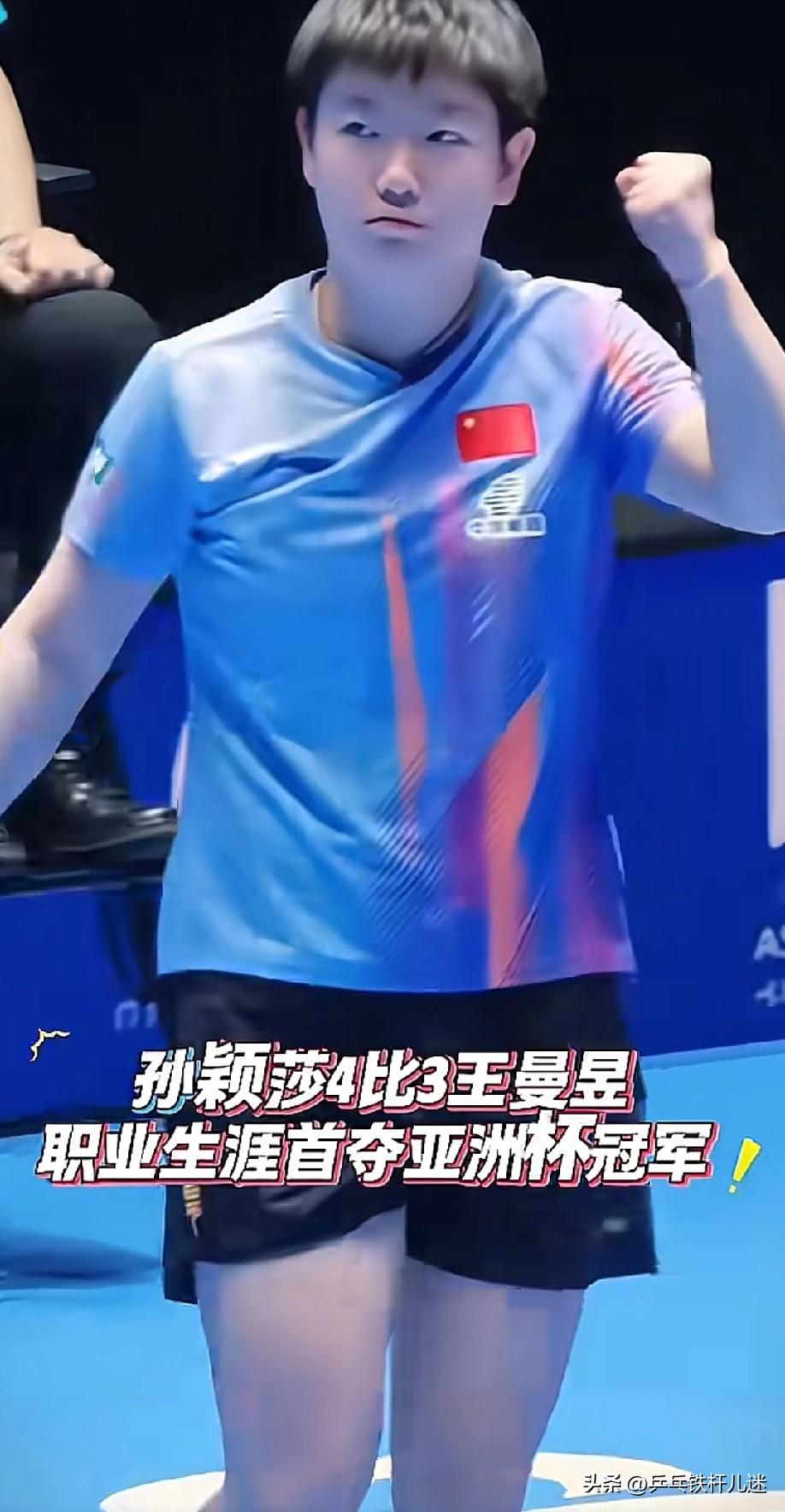 在今天的比赛中,孙颖莎4:3战胜王曼昱,首夺亚洲杯冠军。 比赛过程惊心动魄,莎莎在关键时刻的大心脏,展现出了世界顶级运动员的风范! 莎莎 一路过关斩将,杀出重围,一路登顶,莎莎太不容易了。 原来就有解说说她胳膊短, 护台面积小, 反手不行等等等等 ,但她却一直在努力证明自己。 恭喜莎莎夺取亚洲杯冠军🏆!可喜可贺!