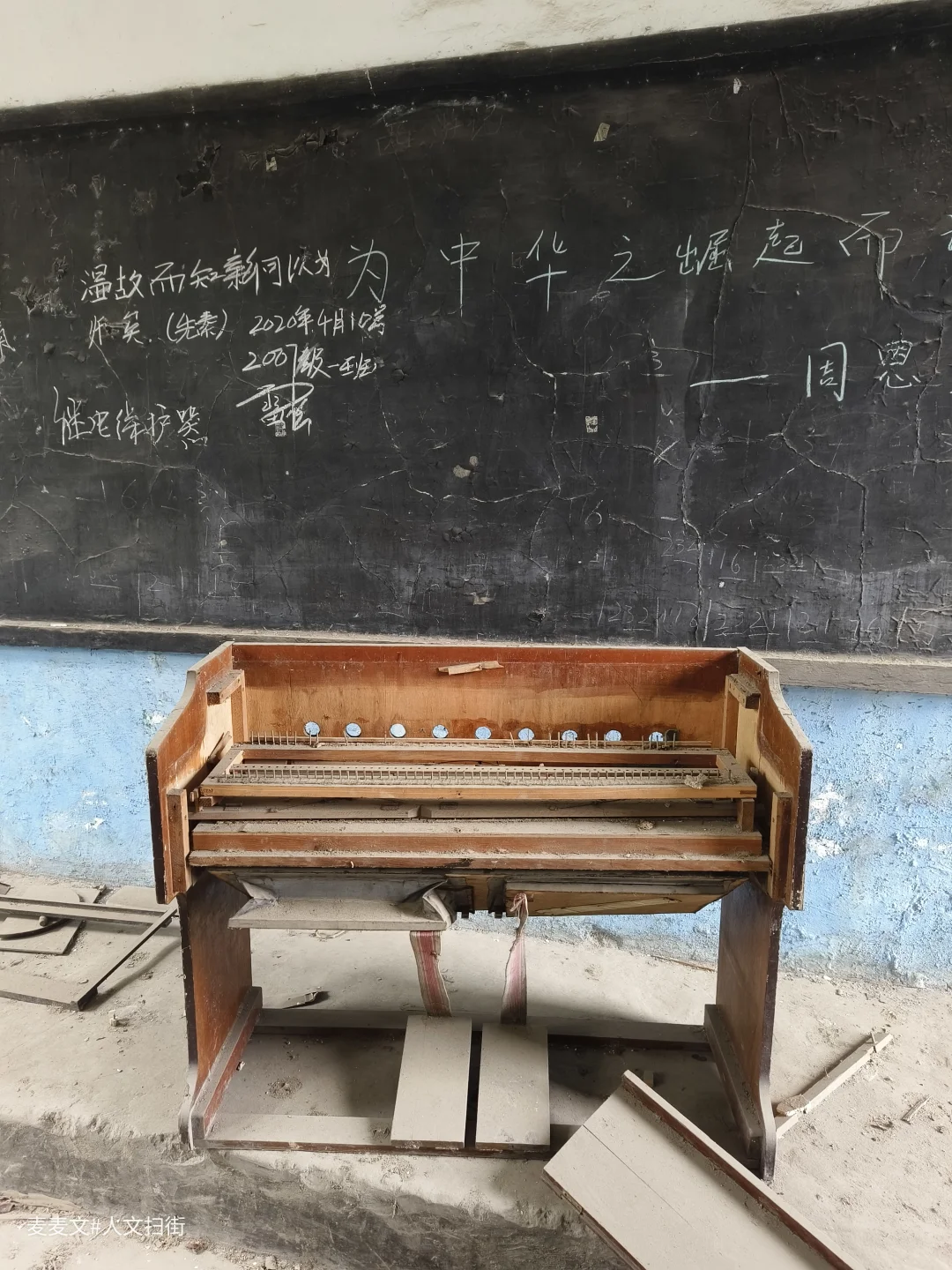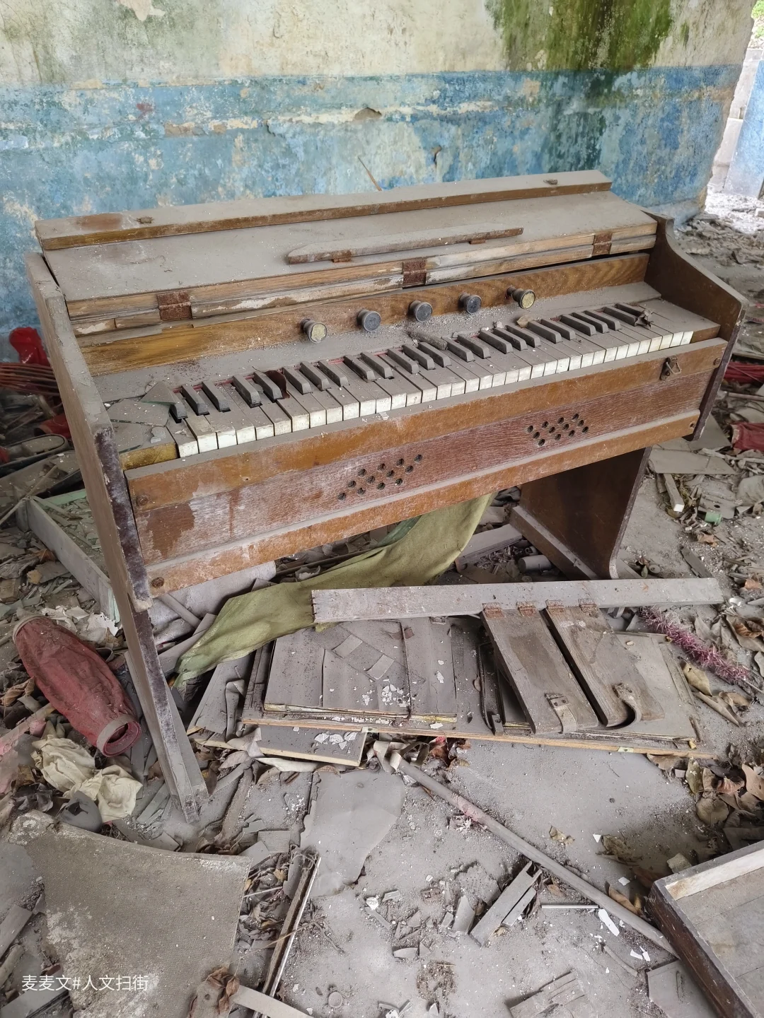 偶遇一废弃学校,校园里杂草丛生,昔日的操场跑道破败不堪,篮球架也倾斜着,仿佛在诉说着往昔的活力与如今的落寞。教学楼的门窗大多都破了,玻璃碎了一地,在阳光下闪烁着杂乱的碎片。 当我来到音乐教室时,却有意外之喜。几个风琴还在角落里静静地伫立着。它们看起来饱经沧桑,琴身的漆已斑驳脱落,露出里面的木质纹理,仿佛是岁月镌刻的痕迹。