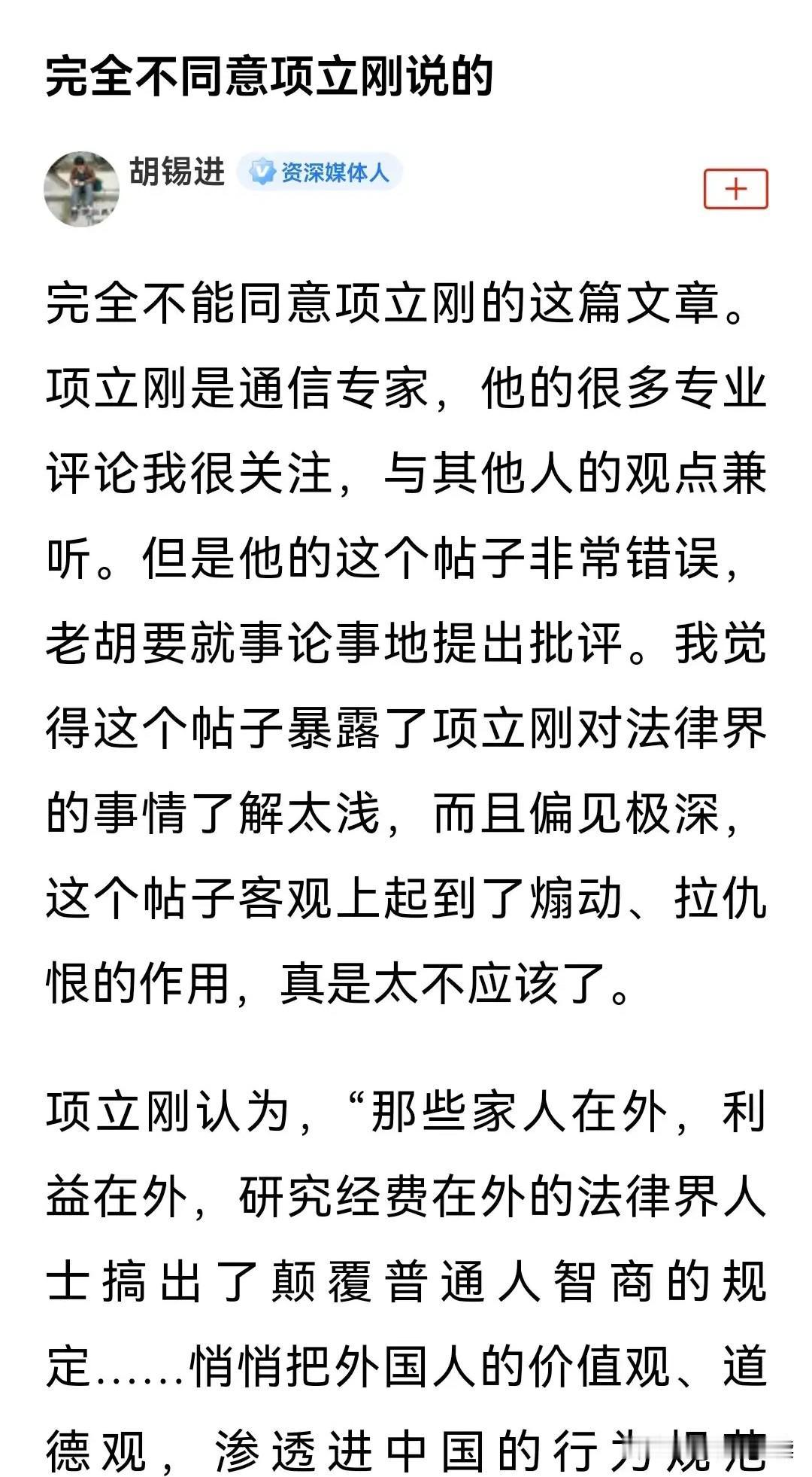最近项立刚与胡锡进的激烈论战,撕开了法治建设最扎心的真相:中国法律界,真的存在盲目照搬西方的倾向,且已经严重偏离人民立场。 官方多次明确强调:中国法治必须扎根中国国情、立足中国文化、解决中国问题,决不能照搬西方模式。 可现实中,部分留洋背景的法学专家,把西方那套程序至上、条文繁琐的体系全盘引入,导致法律越来越“精英化”“晦涩化”。 举个最实在的例子: 老百姓遇到邻里纠纷、劳动争议、小额欠款,本来按情理、按公序良俗就能说得清,可一走到某些程序里,又是举证、又是条款、又是流程,普通人直接懵圈。 这不是学习借鉴,这是水土不服的西化;这不是法治进步,这是脱离群众的危险信号。 借鉴不是盲从,学习更不是下跪。 我们国家一再强调,要建设中国特色社会主义法治体系,法治的根本是为人民服务。 14亿人的大国,有五千年的公序良俗,有独一份的国情民情。 14亿人的大国,有自己的文化、传统和民情,不能拿别国的制度硬套。 好的法治,应该是简单、明白、公道, 而不是越搞越玄、越搞越偏、越搞越脱离群众。 真正为人民的法律,才能护得住民心、守得住正义。 我们不反对吸收人类法治文明成果,但坚决反对唯西方马首是瞻;我们尊重专业,但更要求法律接地气、合民意、守公序良俗。 法治的灵魂,不是条文多复杂、术语多高深,而是让老百姓看得懂、信得过、用得上。 真正的中国法治,必须姓“中”、为“民”,守住中国立场、中国价值、中国情理,绝不做西方理论的搬运工!
