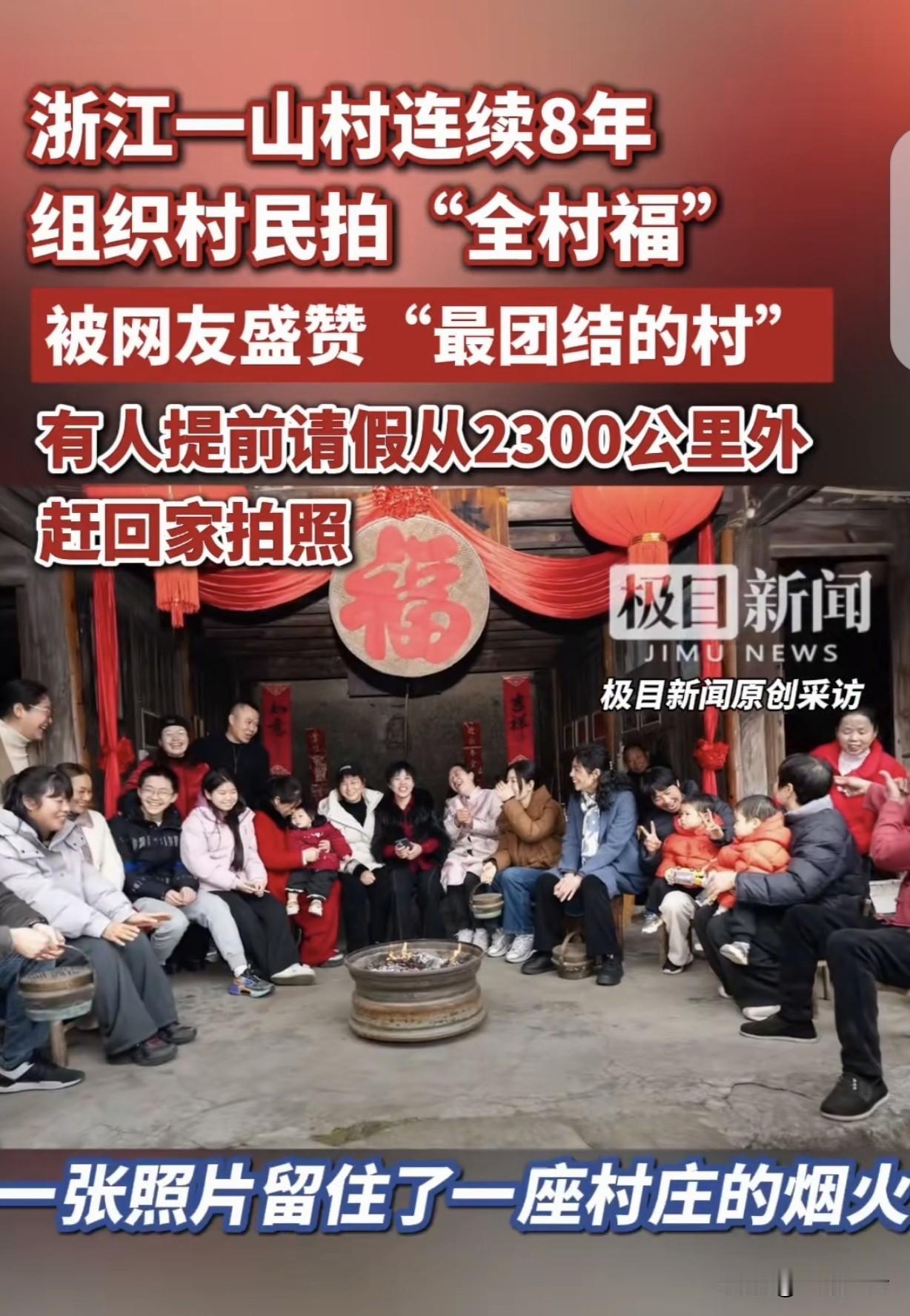 “太羡慕了!”浙江绍兴,一男子提前请假,从2300公里外的哈尔滨,赶回老家,就为了回村里拍“全家福”,他们村连续8年,组织500个村民拍“全家福”,都不用动员,时间到了,远在天南海北的游子们都放下手里的工作,千里奔赴,哪怕拍完照再回去上班,都不会缺席。网友:最团结的村,让家乡的根深深扎入游子的心,代代传承! 一男子的老家,是浙江绍兴东山村,他在哈尔滨工作和生活。 但无论多忙,他都在每年的年末,提前请假,跨越2300公里往家赶,雷打不动,日复一年。 而男子老家的这个村子,被称为“特别团结的村子”。 每年一到特定时候,就像被施了魔法一样,远在天南海北的游子们,不管手头工作多忙,都会放下一切,千里迢迢赶回村里,就为了拍一张“全家福”。 2026年也是一样,所以男子才千里奔赴,一路风尘仆仆,心里就盼着能赶上这重要的时刻。 这拍“全家福”的传统,已经坚持了整整8年。刚开始的时候,村里的老人们还有些不好意思出镜。 他们一辈子面朝黄土背朝天,习惯了默默付出,面对镜头总觉得不自在。 可年轻人热情高啊,挨家挨户地劝,跟老人们说这是记录咱们村的大事,以后翻出来看看多有意义。老人们拗不过,这才勉强同意。 没想到,这一拍就停不下来了。到了第二年,不用动员,不用催促,时间一到,大家都主动往村里的集合点赶。 那些在外打工的,哪怕一年就回这一次村,也8年从没缺席。 有的人拍完照,连口水都顾不上喝,就得匆匆赶回工作地,可他们依然觉得值,把这张照片当成过年最珍贵的仪式。 拍“全家福”那天,村里热闹得像过年一样。孩子们在人群里嬉笑打闹,年轻人忙着帮老人们整理衣服、梳梳头发,一家人相互搀扶着,脸上都洋溢着幸福的笑容。 摄影师一声令下,大家都挺直了腰板,露出最灿烂的笑容。“咔嚓”一声,时间仿佛在这一刻定格,把全村人的欢乐和温暖都留在了照片里。 8年里,村里也发生了不少变化。有人离开了这个世界,让人忍不住伤心落泪。 也有新生命诞生,给村子带来了新的希望和活力。 但不管怎么变,每年拍“全家福”的传统一直没变。 这张照片,就像一条无形的线,把全村人的心紧紧连在一起。 它留住了村庄的烟火气,让那些漂泊在外的游子,不管走多远,都能找到回家的路。 看着这张凝聚着全村人情感的“全家福”,大家心里都暖乎乎的。 这不仅仅是一张照片,更是中国人最浓的年味,是家乡的根深深扎入游子心中的见证。 它会让这份团结和温暖代代传承下去,让这个村子永远充满生机和活力。 有人说,我们村接近3000人,拍合照是很难啦。一个生产队吧?一个村都不止500多人。我不怕多我一个。就怕差的那个人是我! 这个村很暖心,满满的亲情感和回忆!其实我们不管走到哪里,在哪儿发展、拼搏、成就,我们都有一个来处,那就是我们走出来的地方。在想家的时候、在陷入困境的时候、在夜深人静的时候,我们拿出来回忆回忆,可能是对我们心灵深处最大的慰藉! 浙江绍兴东山村这连续八年的“全家福”之约,真的太让人动容了。 在快节奏的现代社会,很多人都在为了生活四处奔波,家乡似乎变得越来越远。 但东山村用这八年如一日的坚持告诉我们,家乡的根永远扎在心里。 这份团结和温暖,不仅治愈了游子的乡愁,更会代代传承,让村子永远充满生机。 希望这样的传统能在更多地方延续,让更多人感受到这份浓浓的乡情。 对于这件事,你怎么看? 欢迎关注@一案一论