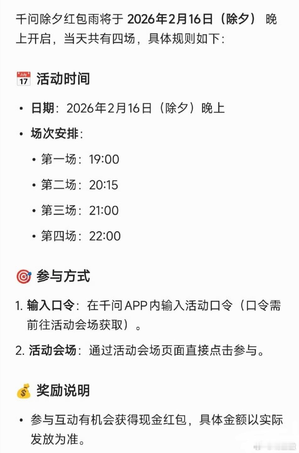 定好闹钟、准时蹲守,只要在千问发送口令:“千问帮我来场红包雨”即可直接参与抢红包。