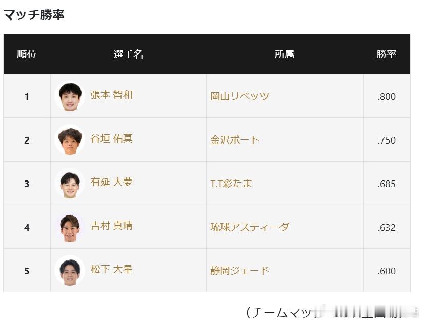 张本智和男单胜率仍为第一,并以12胜3负的成绩排名胜场第三,谷垣佑真15胜5负排名胜场第一。
