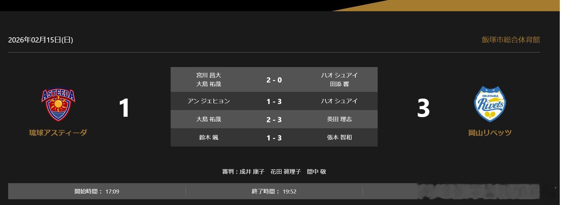 日本乒乓球t联赛 张本智和 张本智和第四盘获胜。260215 琉球 1-3 冈山宫川昌大/大岛祐哉 2-0 郝帅/田添响安宰贤 1-3 郝帅大岛祐哉 2-3 英田理志铃木飒 1-3 张本智和 (8,-3,-9,-8)
