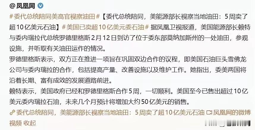 凤凰网:委代总统陪美高官视察油田!川普抓捕马杜罗后,委石油由美国经管出售,所得收益双方分成。 据悉双方合作5周以来,美已卖出10亿美元委内瑞拉石油。未来几周销售将达50亿美元,双方各有进账。 表面看美国强扣委石油,出售后两国利益分成,是标准霸权行径!但如美将委封死,委一分钱都没有啊! 本质是马杜罗反美,川普专治不服!封锁海运抓老马,迫委签订城下之盟,经管石油销售控制资源流向,反美国家不给一滴石油,看你服不服? 另有央视报道:美伊正在接触谈判,伊朗拿出足够诚意,将石油天然气、矿产投资与飞机采购,纳入谈判文本,让美方获利,换取美放松制裁! 伊朗这个举措,是否与委内瑞拉如出一辙?是否算出卖国家主权?苍狼有点搞糊涂了!当然这是另外让步,关键是中程导弹与核研发怎么谈呢? 不管怎么说,伊朗是想服软了!与老美达成和解,比双方开战损失小!光棍不吃眼前亏,识时务者为俊杰。比只会喊打喊杀的网拳战狼聪明多了! 纵观世界大势,老美拿下南美已不是问题,拿下马杜罗,佩德罗服软,古巴被断能源供应,还能挺多久呢? 美帝稳定中东计划,也将实现目标!搞定伊拉克利比亚,摁住“哈真胡”,策反叙利亚,现在伊朗也服软了? 搞定这一切,最后是哪个?应该是俄乌战争吧!这是当前世界乱局之根源,解决这个问题,世界将现和平! …………