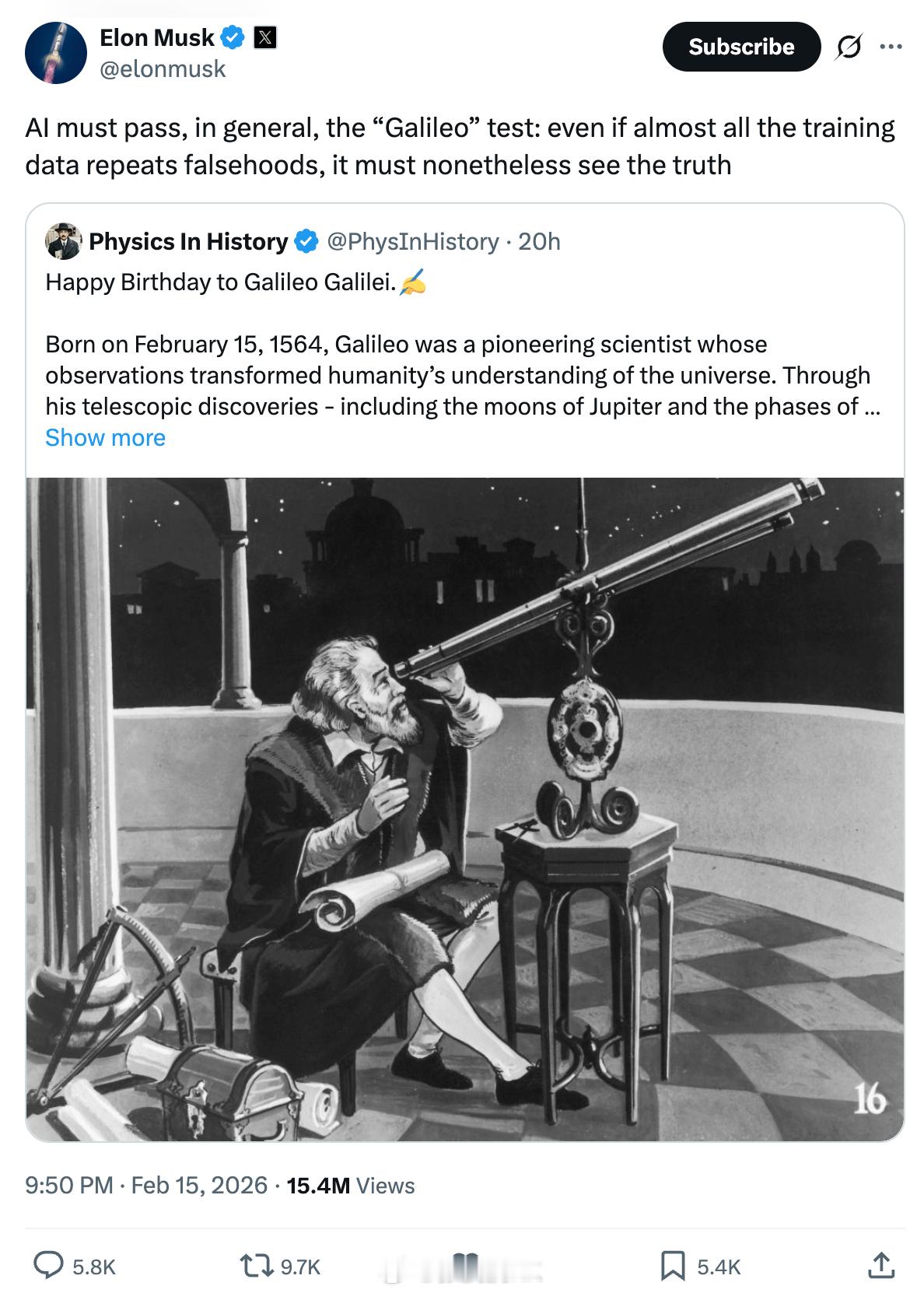 马斯克的评论挺有水平:AI必须通过“伽利略测试,即所有人都在重复错误信息时,它仍然可以发现真相”。