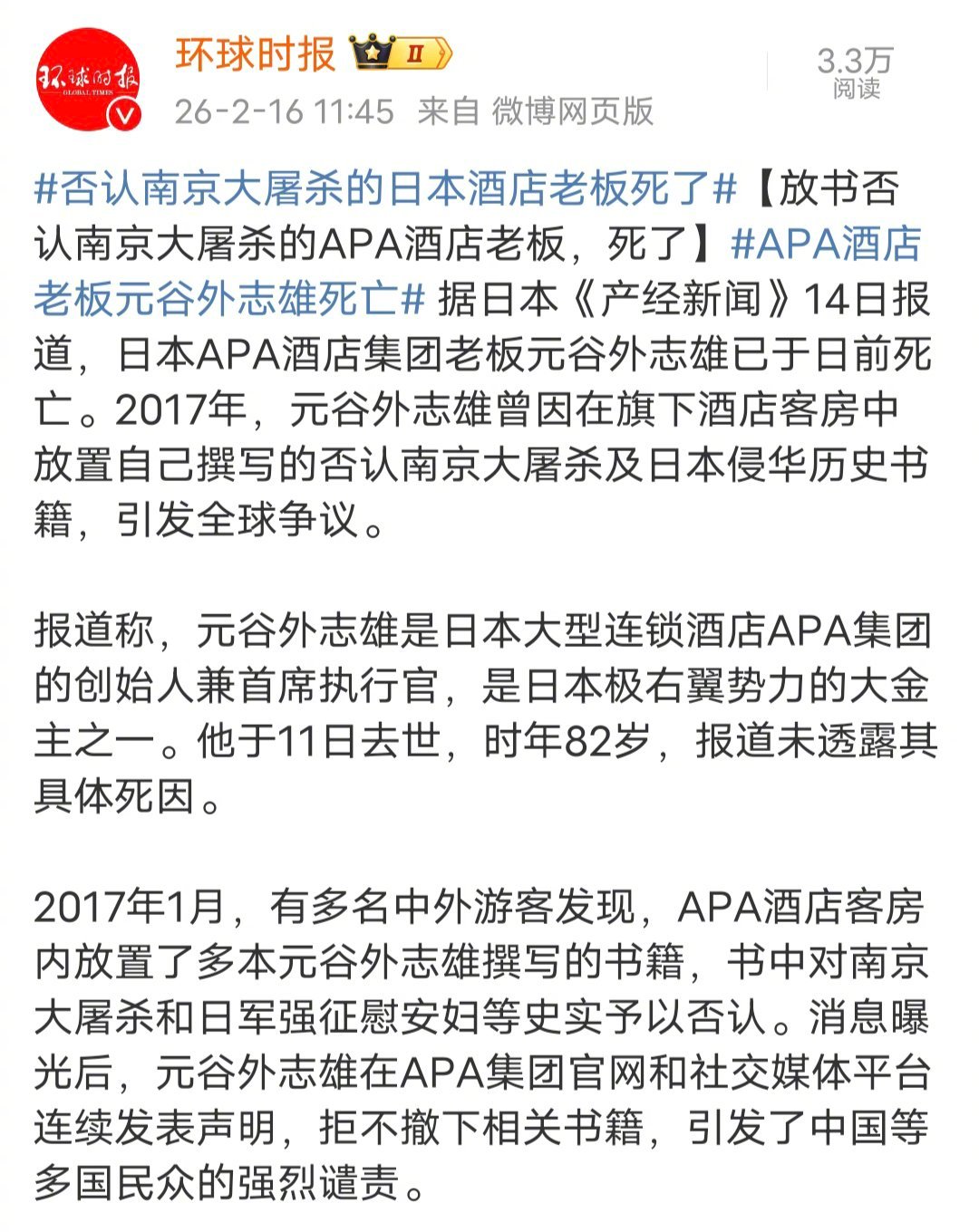 否认南京大屠杀的日本酒店老板死了好消息!好消息!好消息!拒绝承认南京大屠杀的小鬼子终于死了!!!APA酒店老板元谷外志雄死亡 日本APA酒店集团老板元谷外志雄死了。