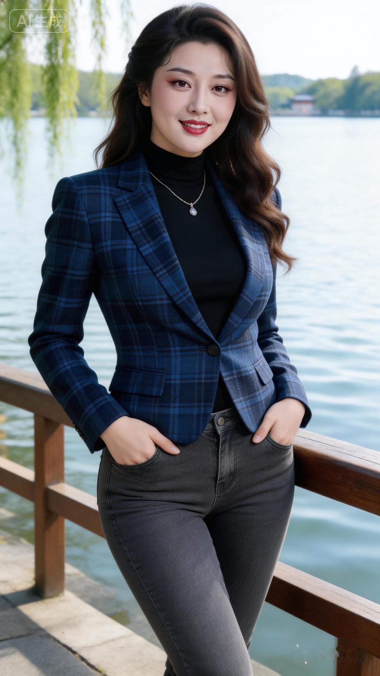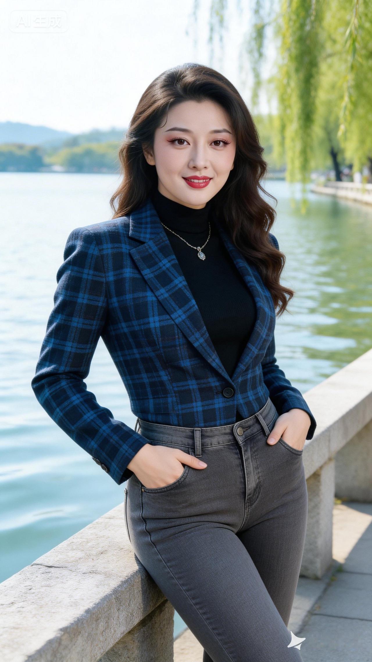优雅职场风穿搭,蓝白相间格纹西装,自信微笑,尽显女性魅力!