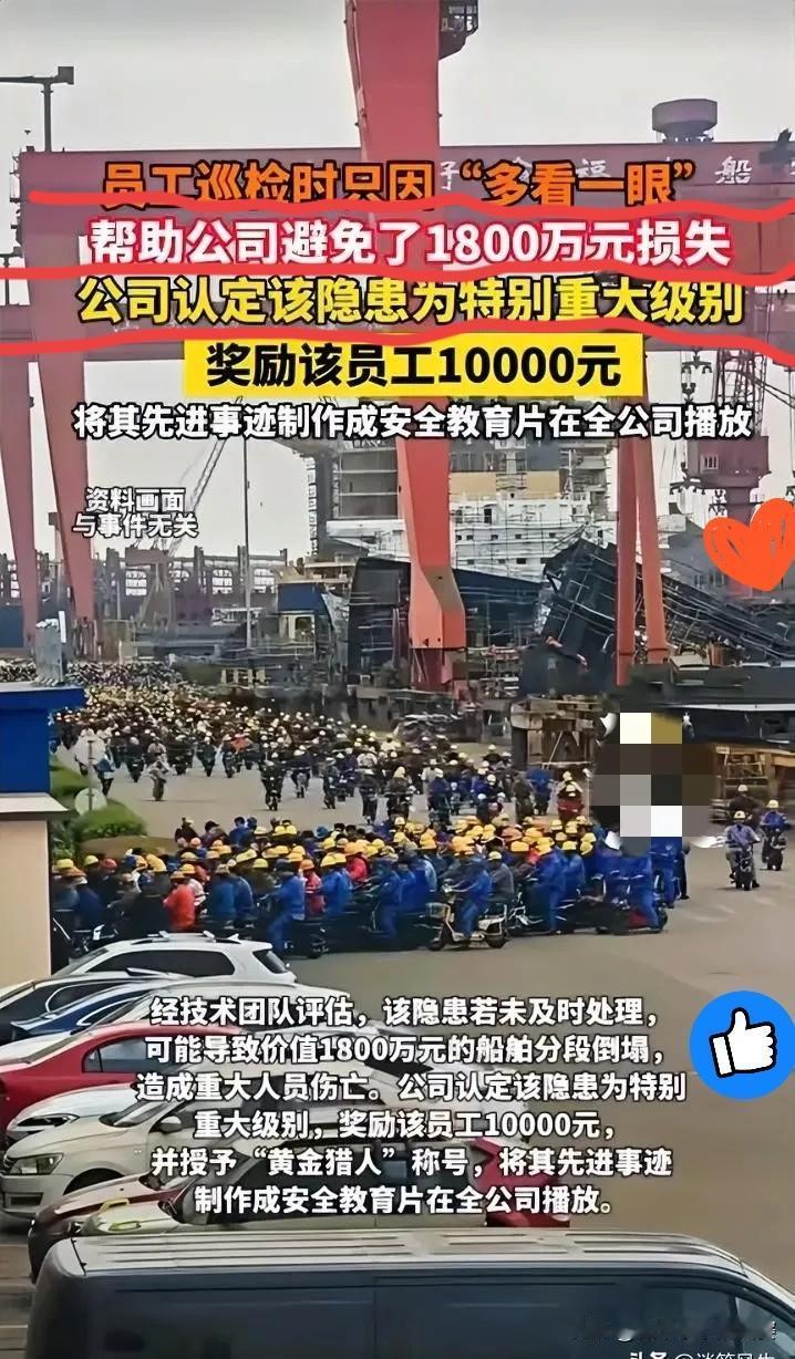 这就是命啊!湖北武汉这位员工,凭“多看一眼”直接救下1800万,太牛了! 武汉船厂一名员工日常巡检,就因为 多留心了一下,发现大型支撑架明显变形,当场果断叫停作业,第一时间上报。就是这短短几秒的警觉,避免了价值1800万的船舶分段倒塌,更守住了现场所有人的生命安全。 公司也特别给力,奖励1万元现金,授予“黄金猎人”称号,还把他的事迹做成安全教育片,让全公司学习。奖金虽不算天价,但这份责任心,千金难换。 安全生产从不是口号,而是藏在每一次认真、每一份较真里。平凡岗位上的细心与担当,才是最牢的安全防线。 为这位平凡英雄点赞!你在工作中遇到过类似的细节救险吗? 长航青山船厂 打工人在船厂 船厂活 船厂监护 船厂老板 长江造船 湖北造船