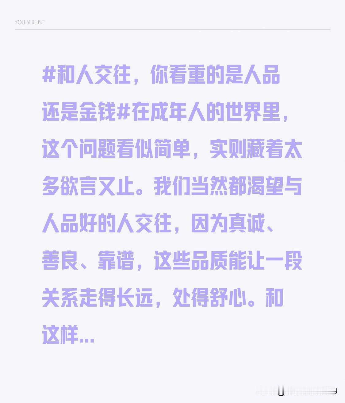 在成年人的世界里,这个问题看似简单,实则藏着太多欲言又止。 我们当然都渴望与人品好的人交往,因为真诚、善良、靠谱,这些品质能让一段关系走得长远,处得舒心。和这样的人在一起,你不用设防,不必算计,哪怕彼此清贫,也能在深夜的畅谈中感受到人性的温暖。 可现实往往又很骨感。当你需要借钱治病时,人品好的朋友可能只能陪着你掉眼泪,而那个你曾看不上的“俗人”,却可能二话不说转来救命钱。当你为了省几块钱货比三家时,才会深刻体会到,金钱虽然不是万能的,但口袋里那点底气,确实能让你在人情世故中少一些窘迫。 所以,与其问看重人品还是金钱,不如说我们最终看重的,是一个人对待人品和金钱的态度。真正成熟的人,会坚守人品的底线,同时拥有赚钱的能力。因为守护人品,是为了让自己问心无愧;而拥有金钱,是为了不让这份人品,在现实面前受委屈。 说到底,最好的交往,是我既能与你共担风雨,也能与你共享繁华。
