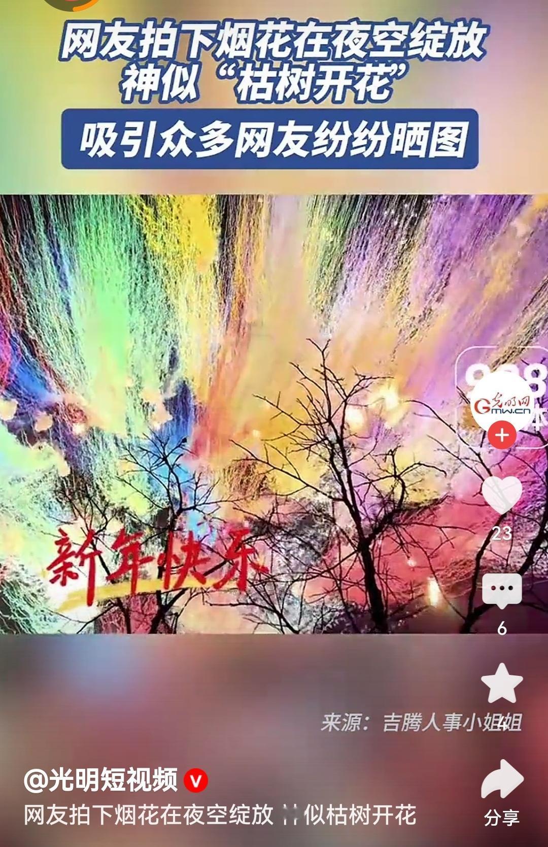 烟花在夜空绽放如枯树开花枯树开花,烟火迎春,这是独属于中国人的浪漫年味。每一朵烟花都是祝福,愿丙午马年,万事皆可期待,枯木亦能逢春,家家户户平安喜乐,好运连连。[比心][比心][比心] 除夕夜烟花 评论打卡任务