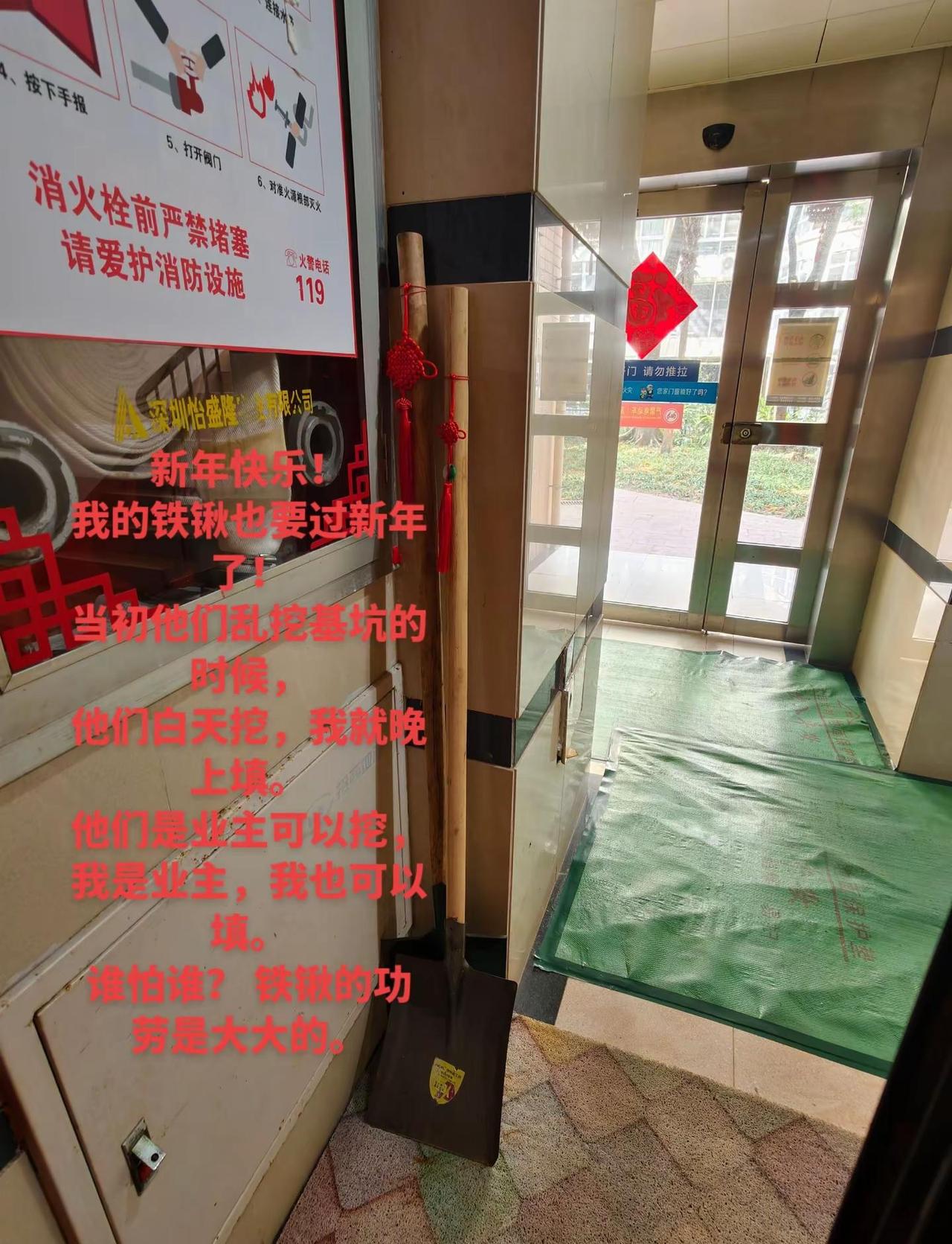 新年快乐!我的铁锹也要过新年了!当初他们乱挖基坑的时候,他们白天挖,我就晚上填。他们是业主可以挖,我是业主,我也可以填。谁怕谁? 铁锹的功劳是大大的。