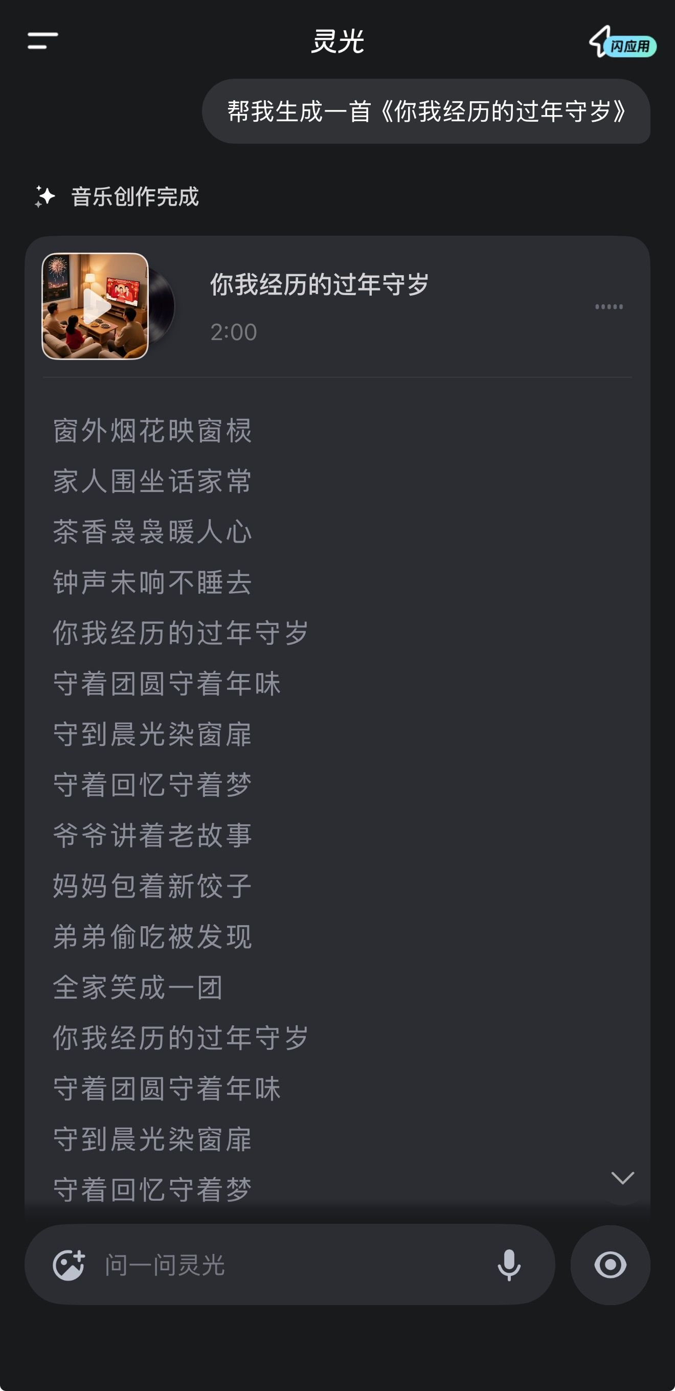 你我经历的一刻菲姐不愧是菲姐,而我的创作也要跟上哈哈,去灵光生成了一首守岁的歌《你我经历的过年守岁》,欢迎大家挑战我的才华我的马年抓马之旅